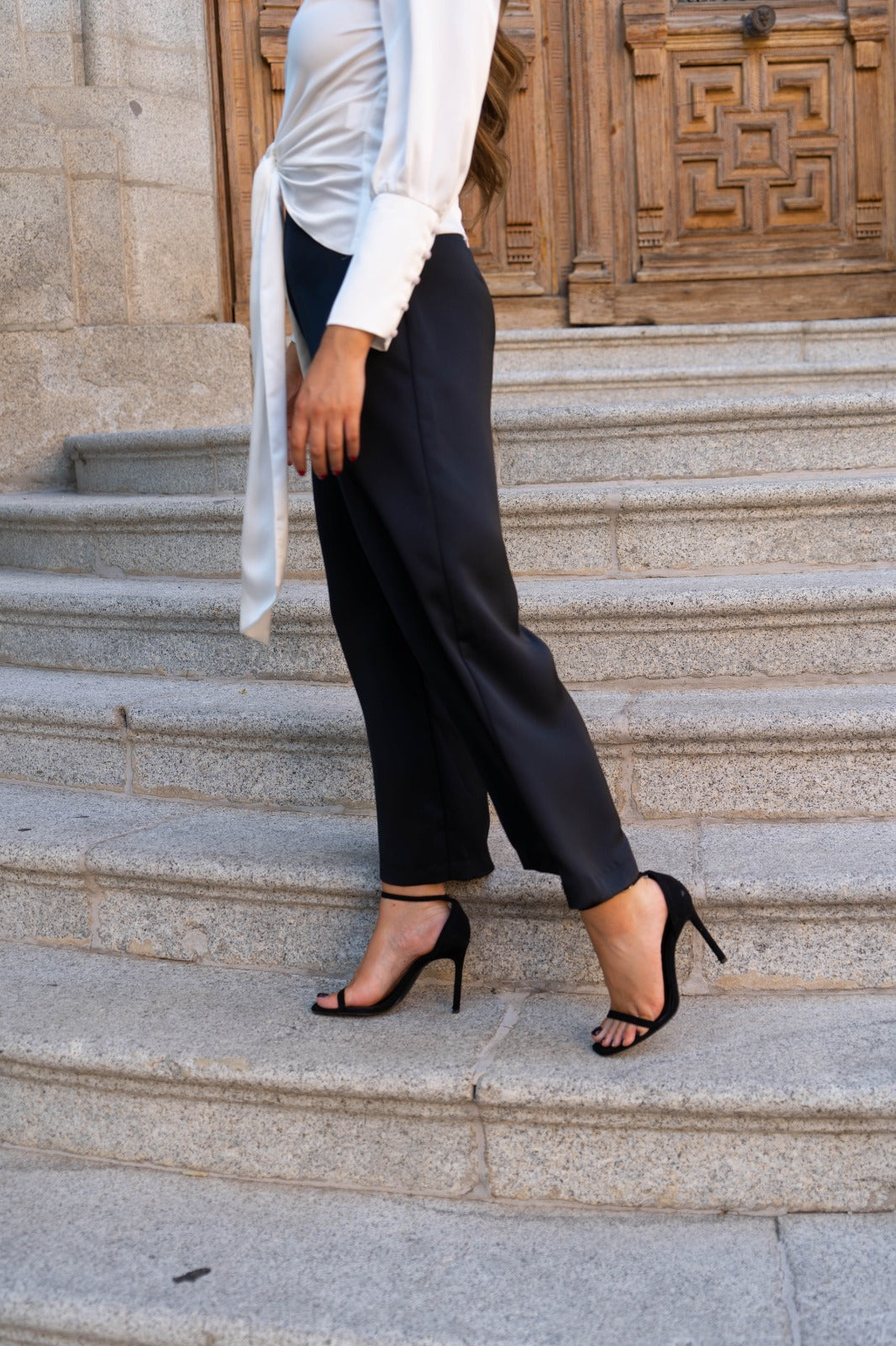 High-waisted trousers, waist, back zipper. In black.