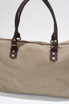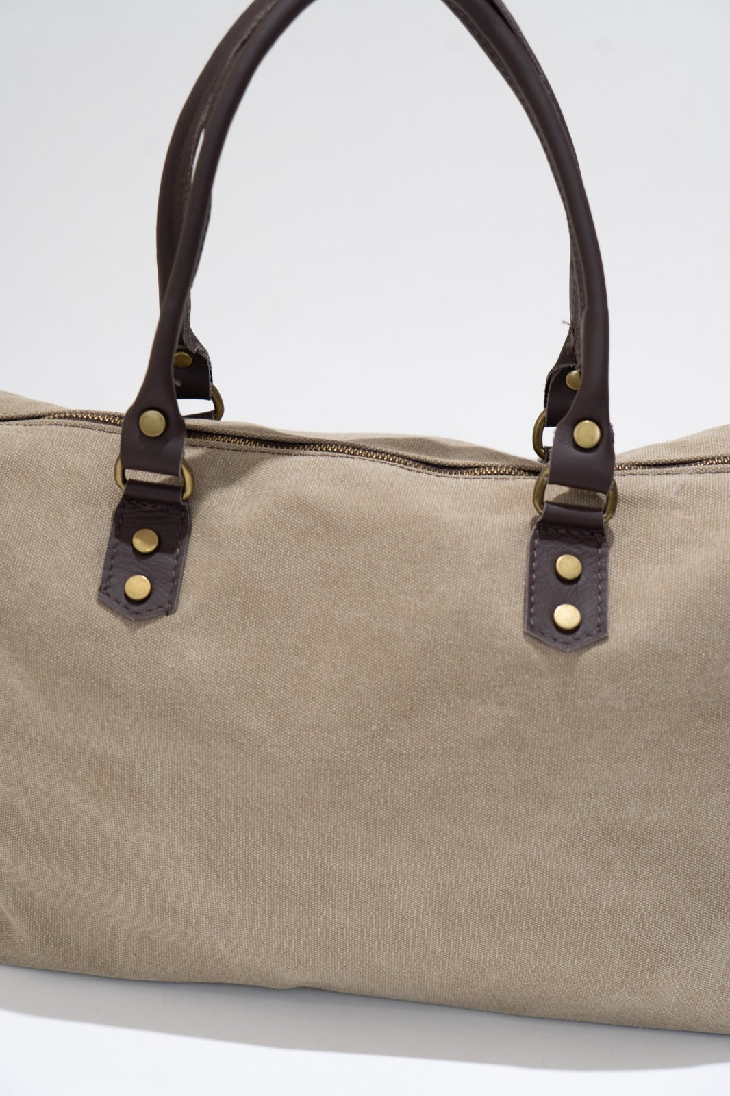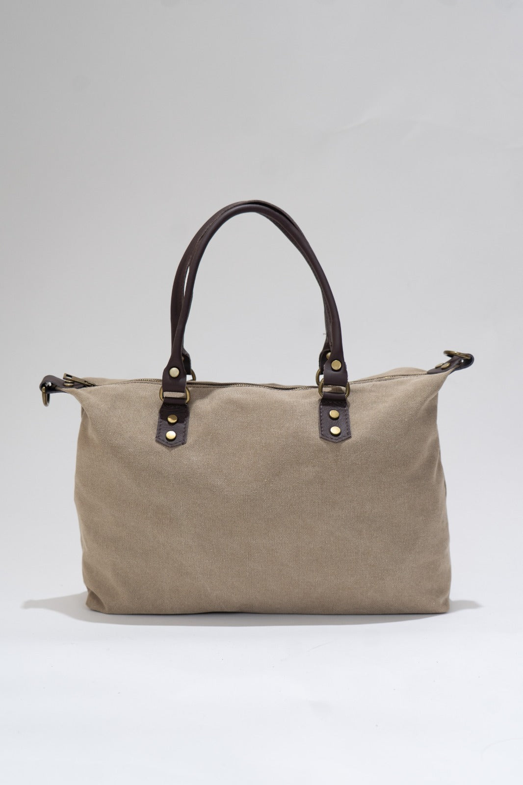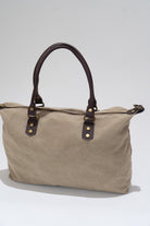 Canvas handbag with fixed leather handles and a removable, adjustable chocolate brown cotton strap. Features a zip closure, black lining, and an interior pocket. Dark beige.