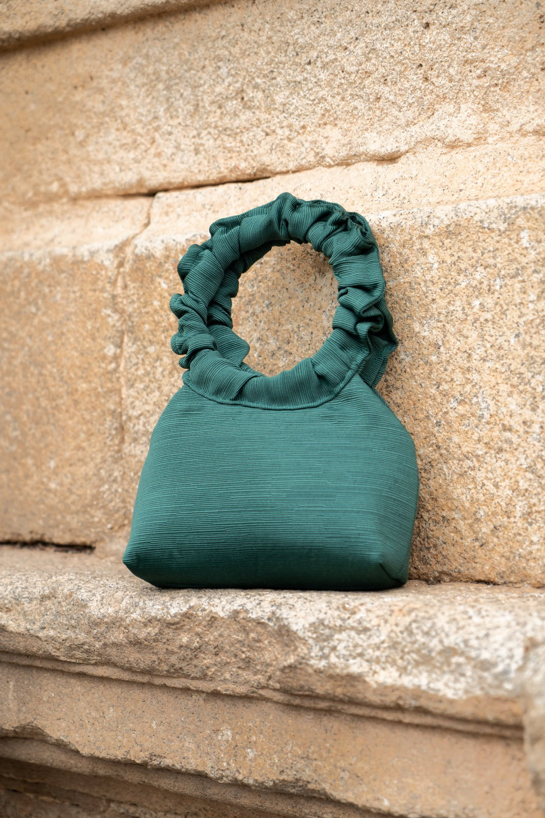 Bag with a round curly handle, lined in natural silk, in green.