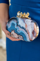 Rigid box with a gold knob and a long chain for hanging. Features multi-colored prints.