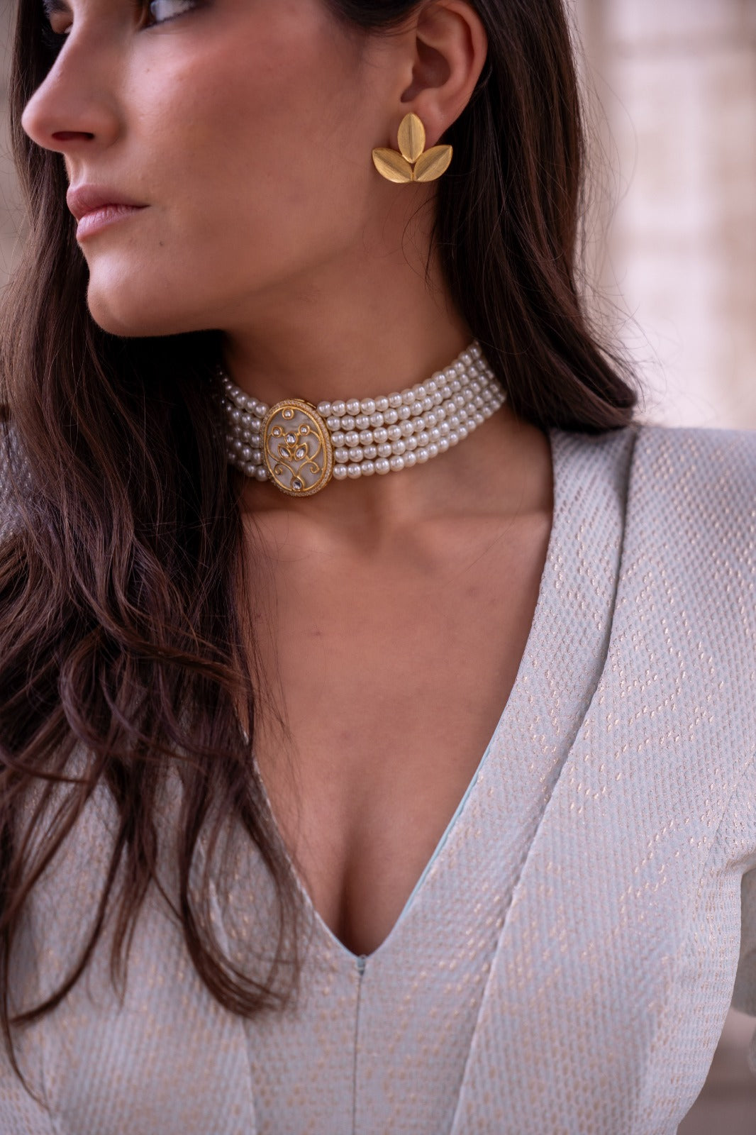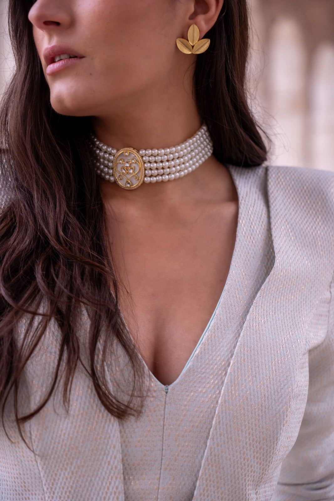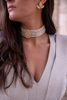 Choker Selin combines four rows of meticulously assembled pearls with a romantic oval center, adorned with a delicate embossed engraving.
