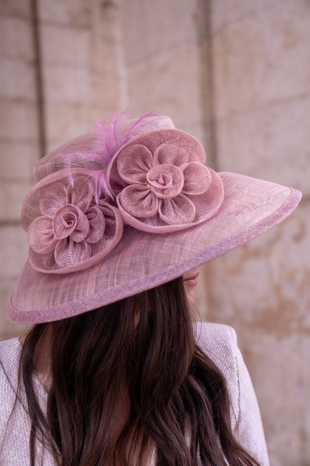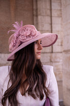 Hat in pink sinamay, with floral details on one side.
