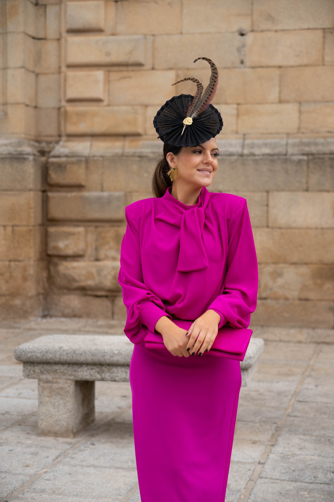 Headdress with a black round base, brown feather detail, and headband to hold.