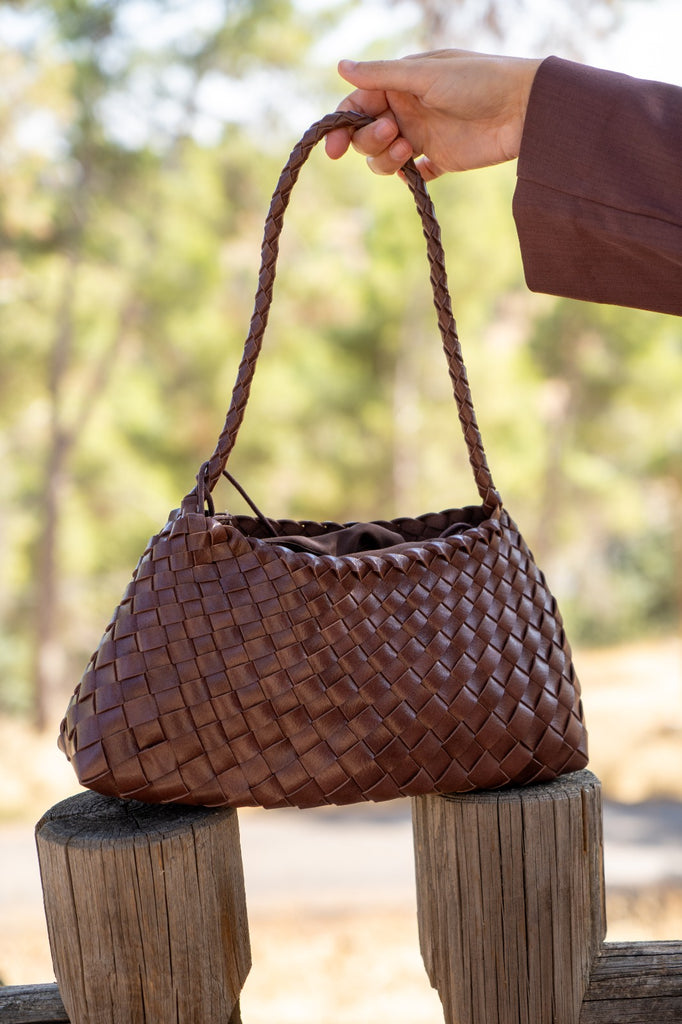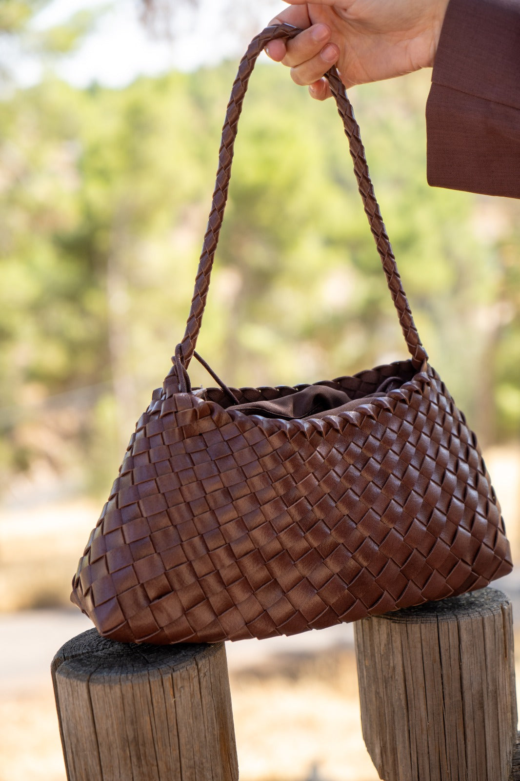 Faux leather handbag, long handle, cross-body faux leather detail, zipper, in brown.