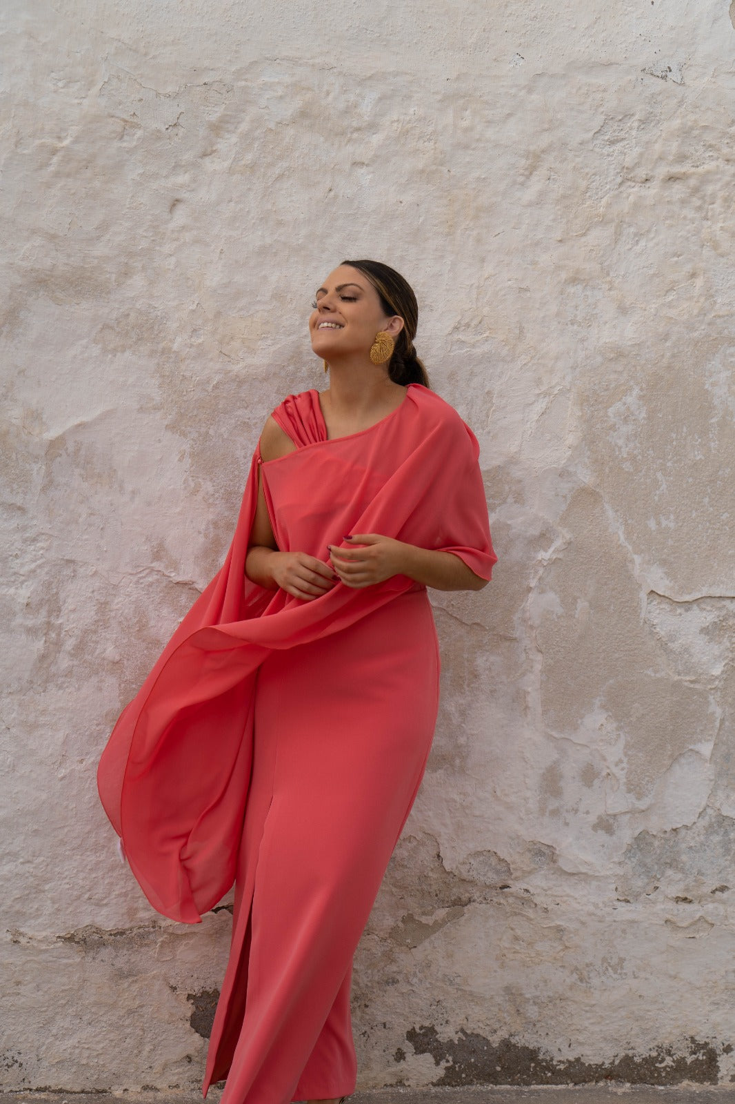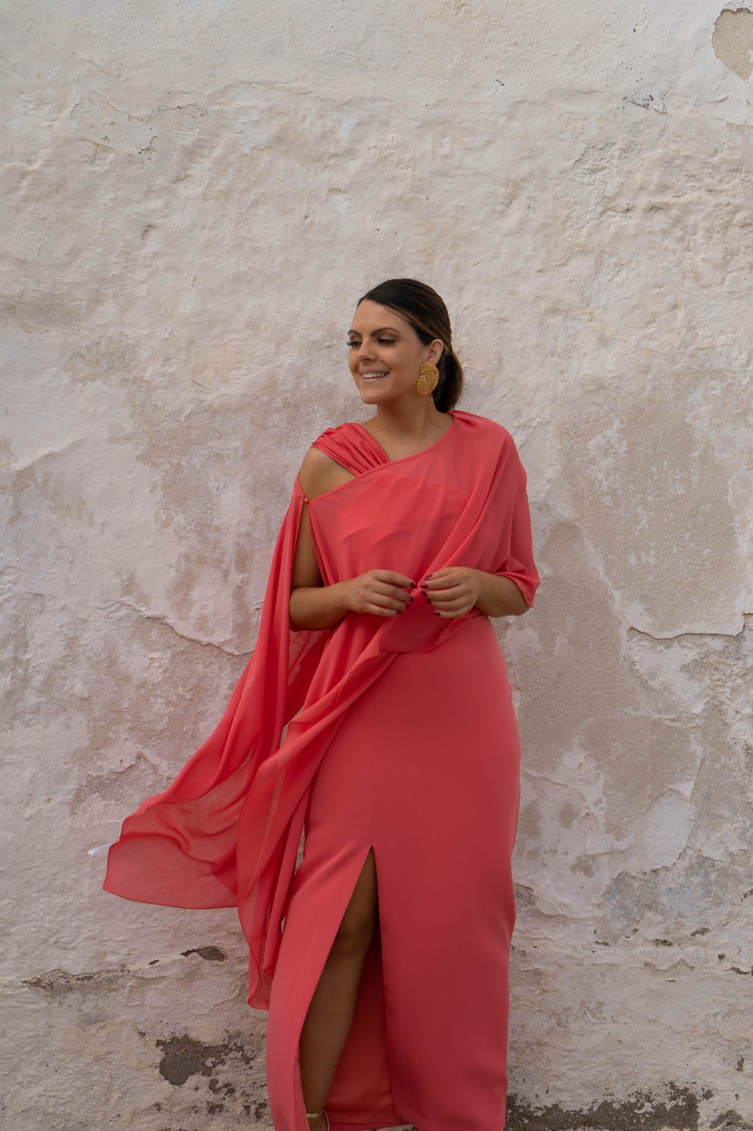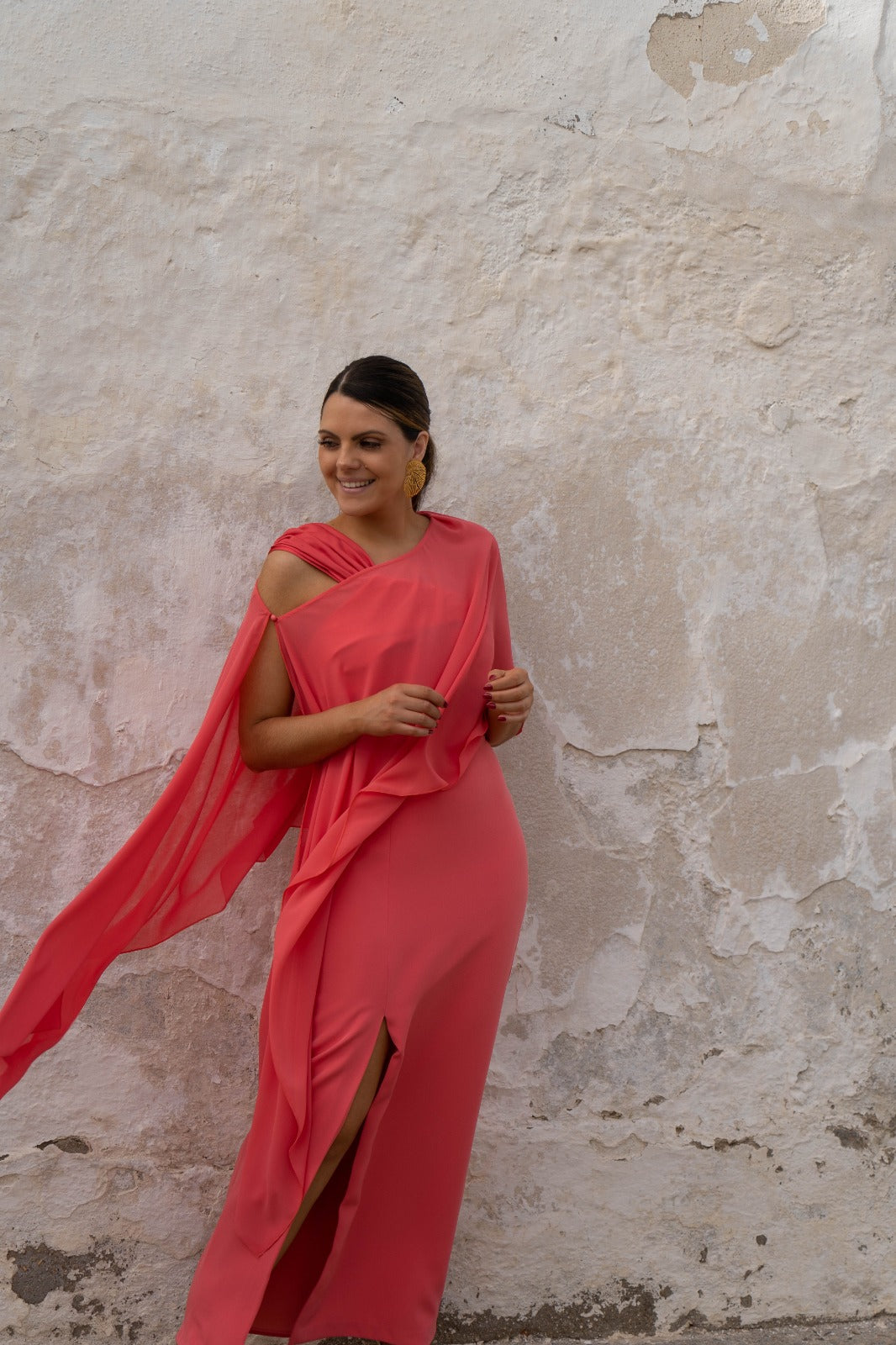 Chiffon cape, short at the front, longer at the back. In coral color.