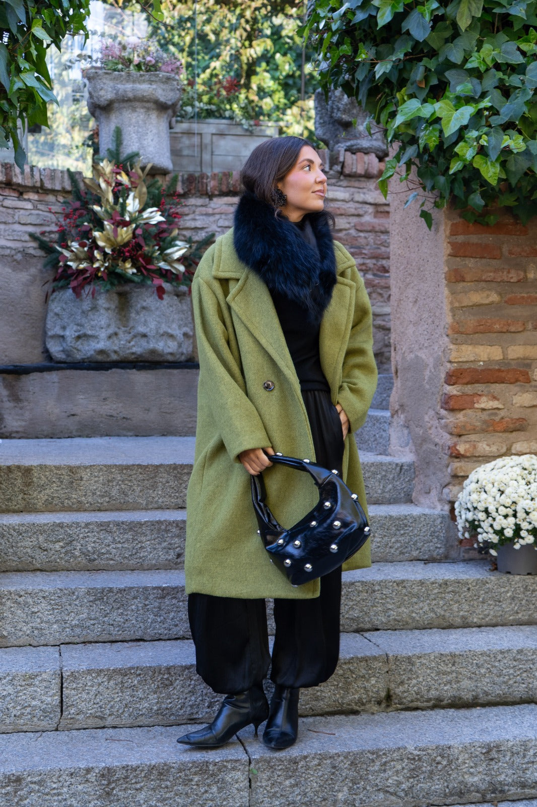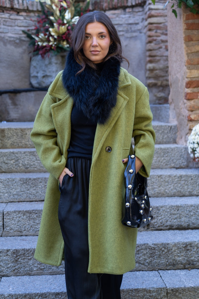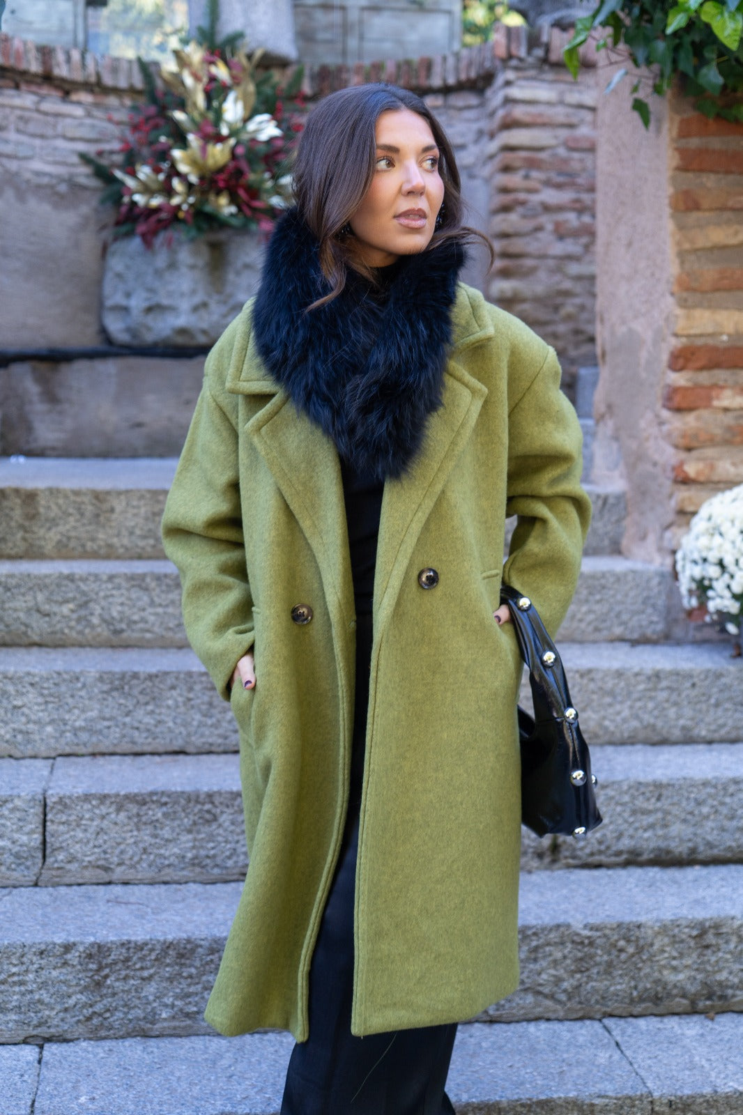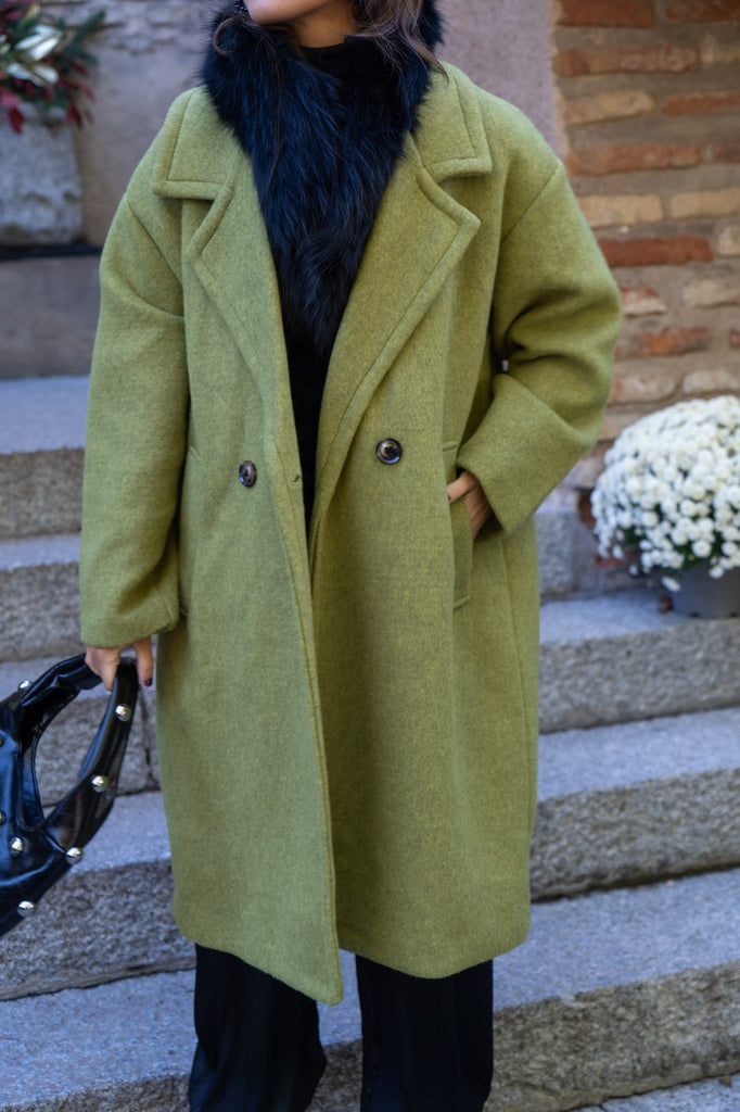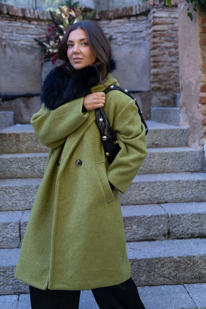Abrigo tipo paño, calentito, cuello solapa, bolsillos laterales, cruzado con botones. En color verde.