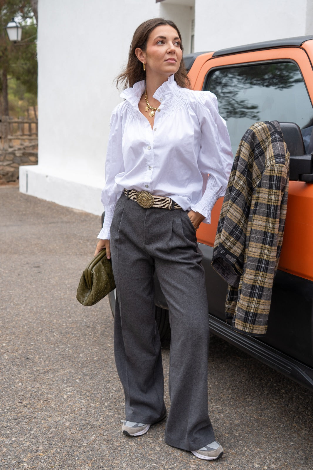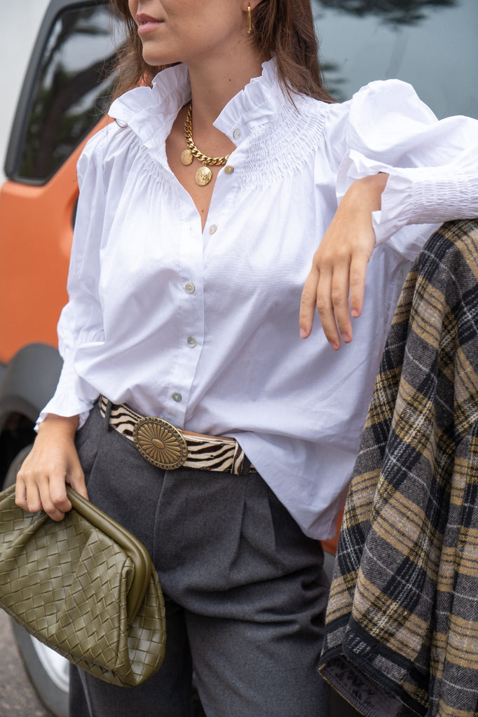 Long-sleeved blouse with gathered cuffs, gathered high neck, buttoned in white.