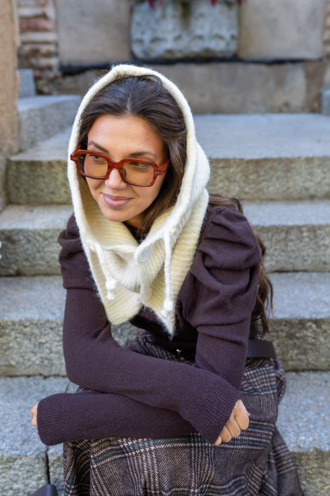 Jersey suave, manga larga, escote redondo, manga abullonada, en color marrón.