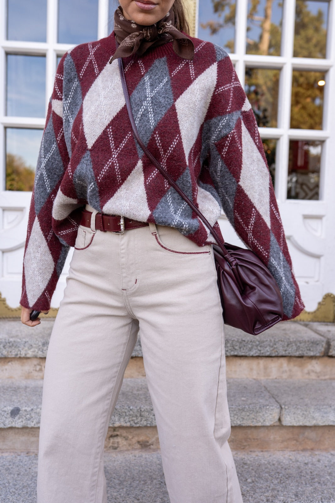 Jersey cuello redondo, rombos en colores burdeos, beige y gris.