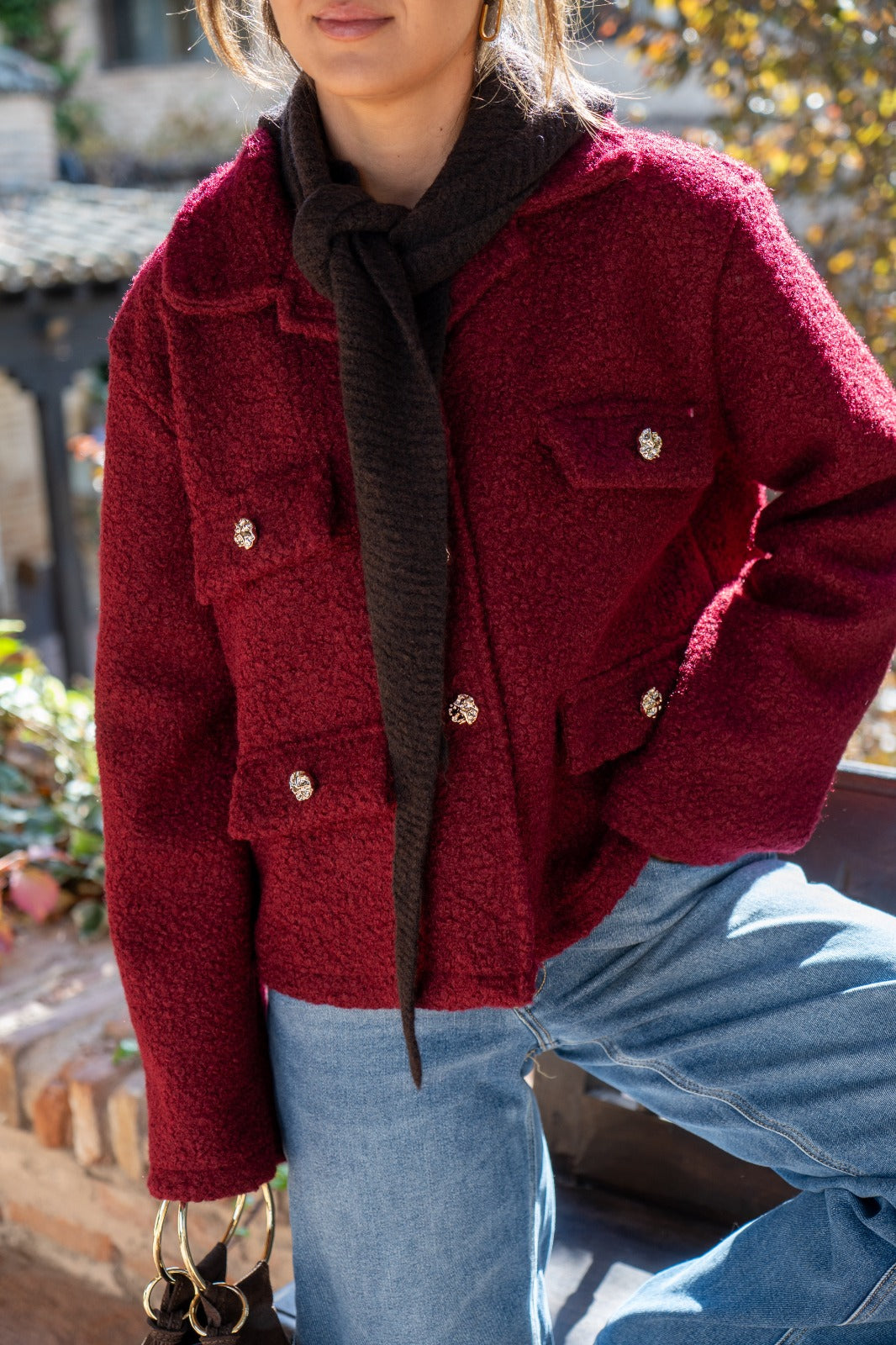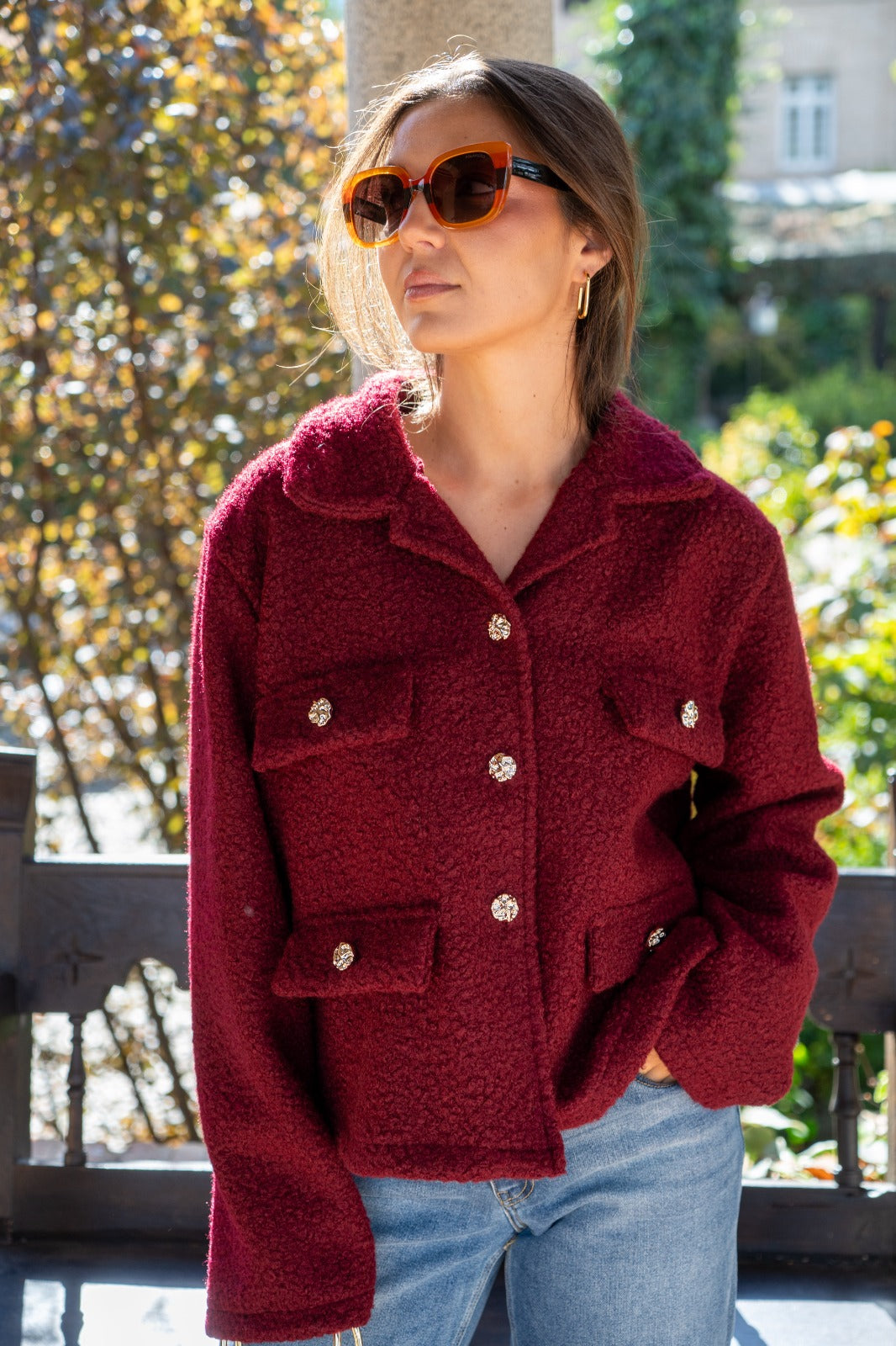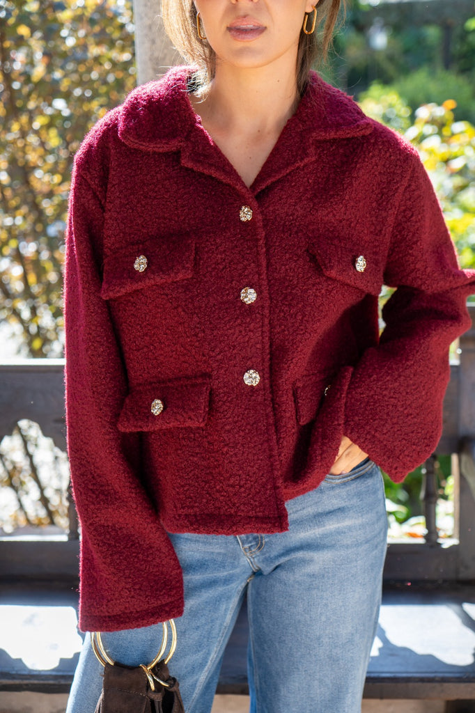 Jacket with lapel collar, faux pocket flaps, and button closure. In burgundy.