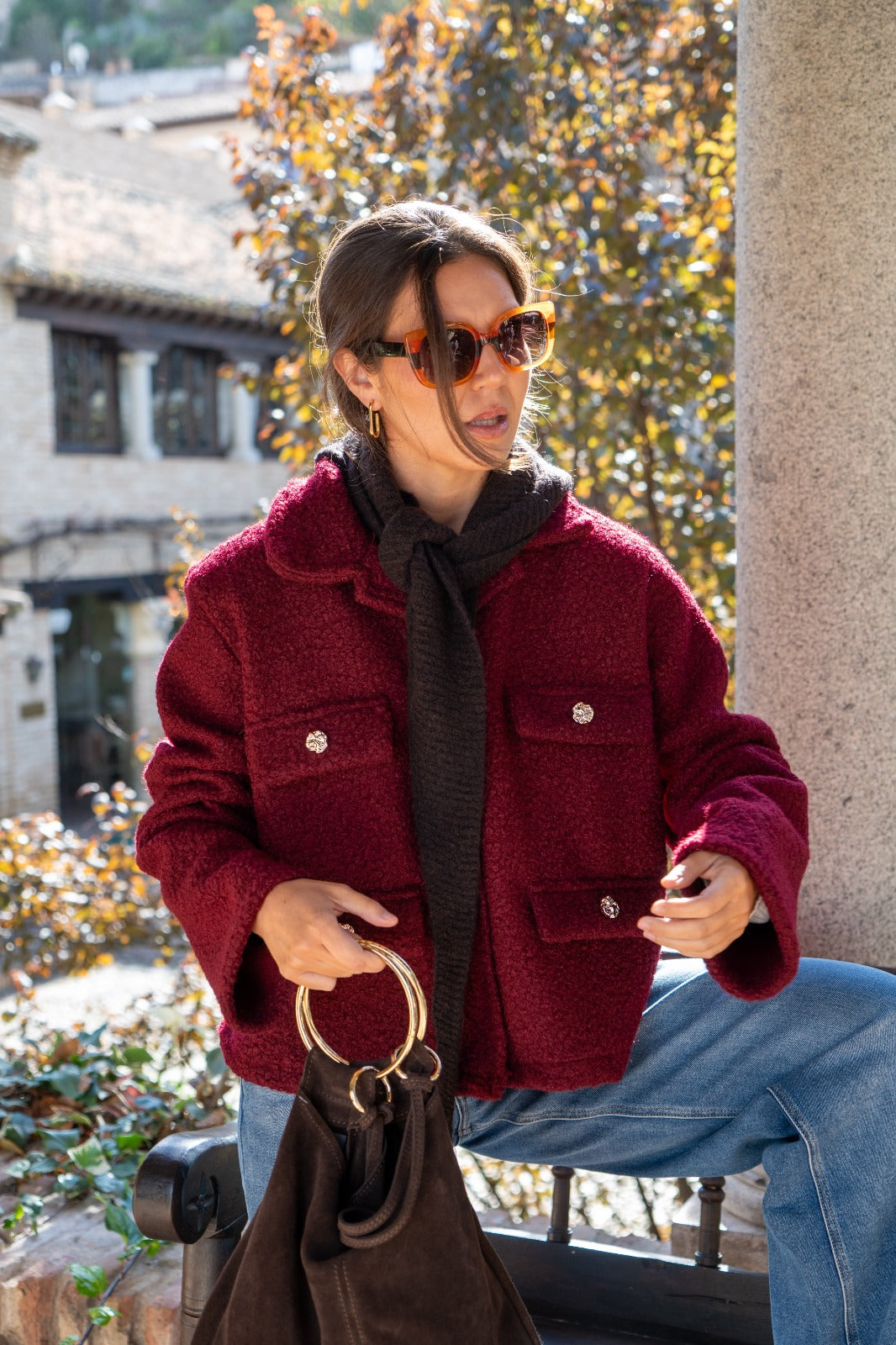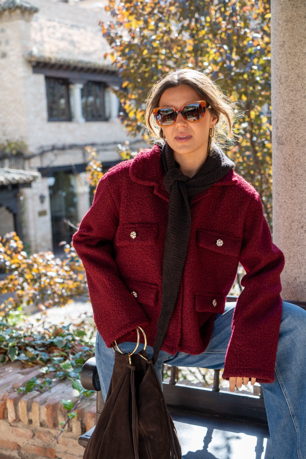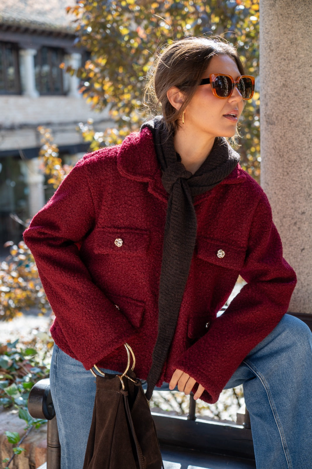 Jacket with lapel collar, faux pocket flaps, and button closure. In burgundy.