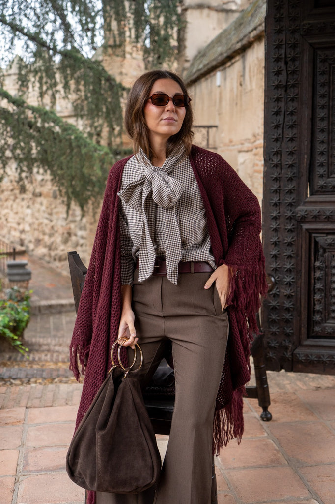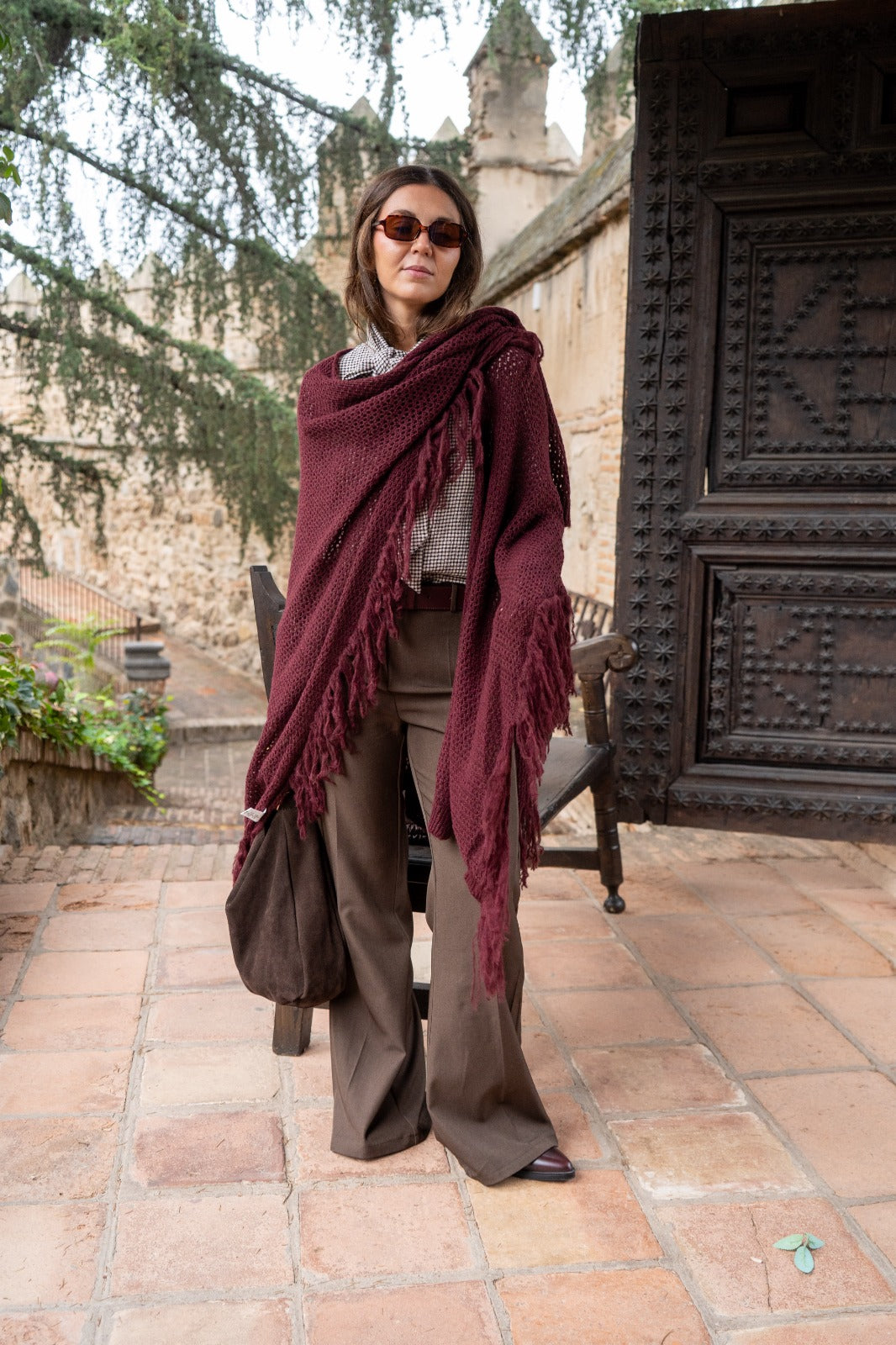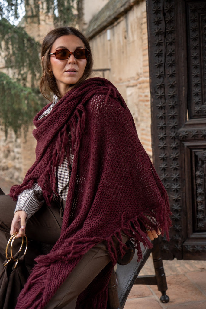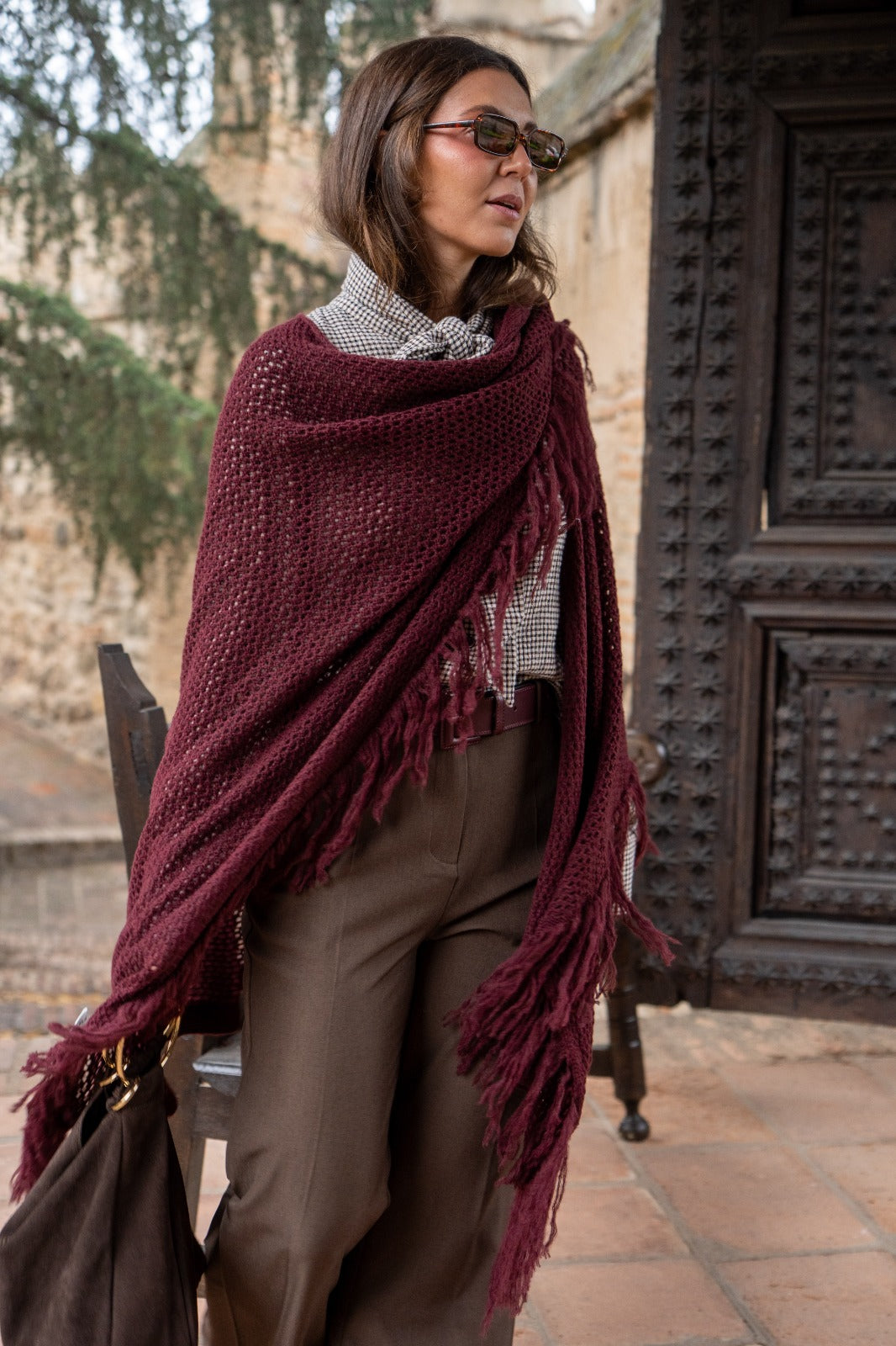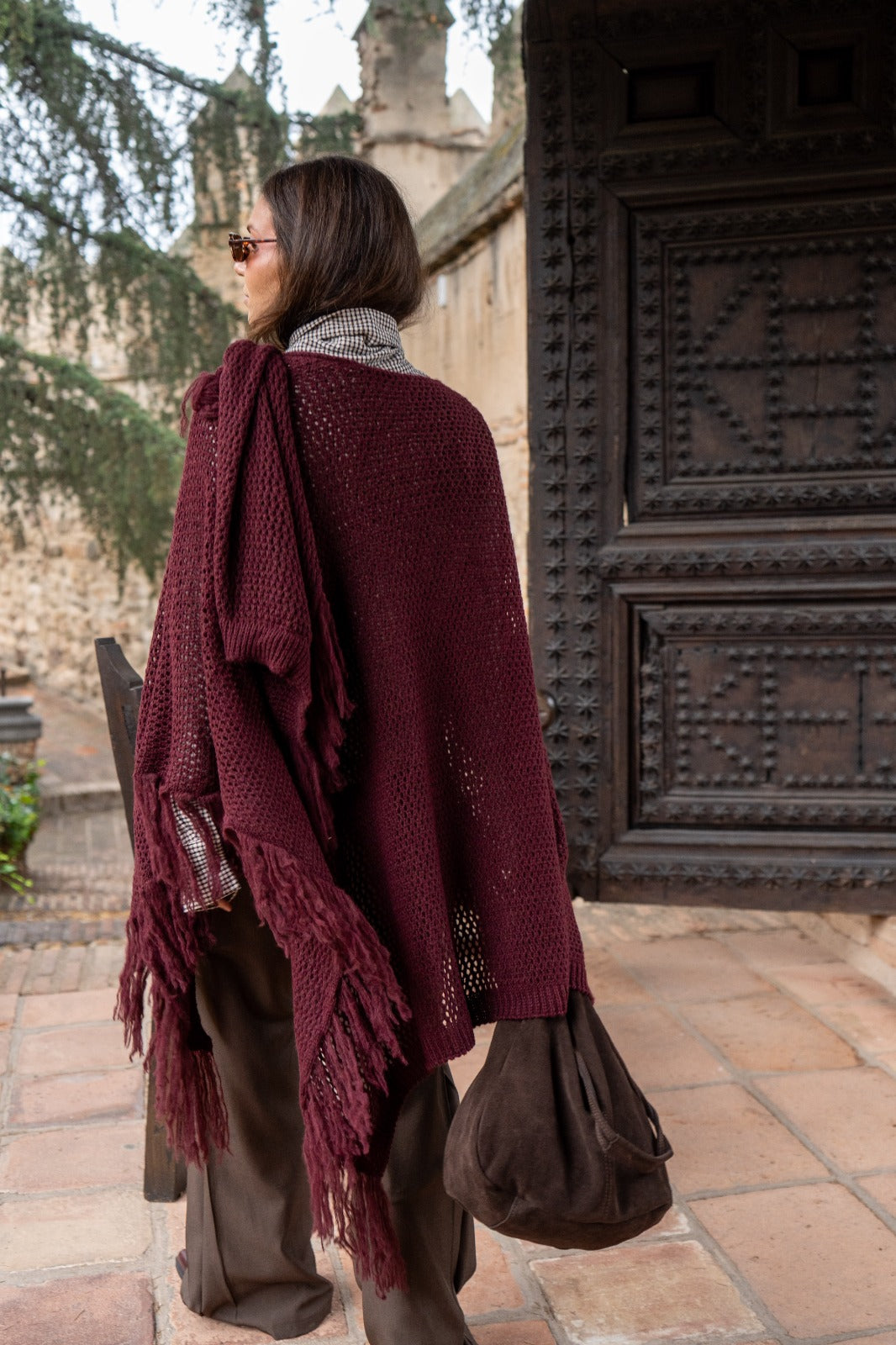 Wool poncho, openwork, fringes on the sides, in burgundy color.
