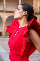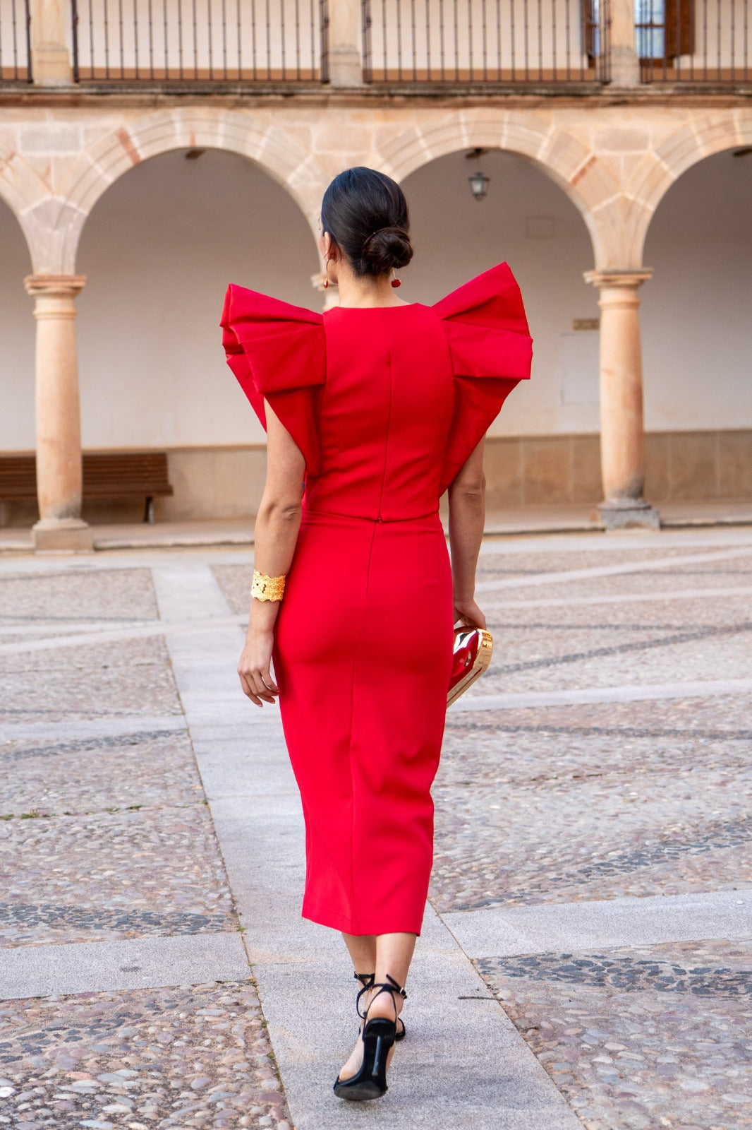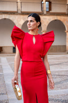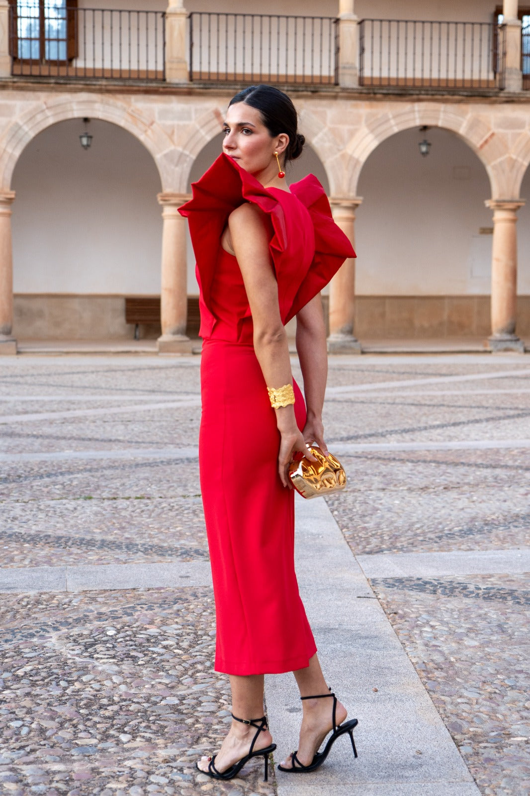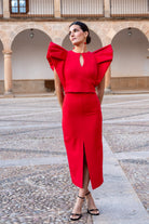 Two-piece set consisting of a sleeveless top with a round neckline, tear-drop opening and maxi ruffle on the shoulders, and a pencil skirt with a front slit. In red.