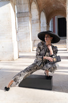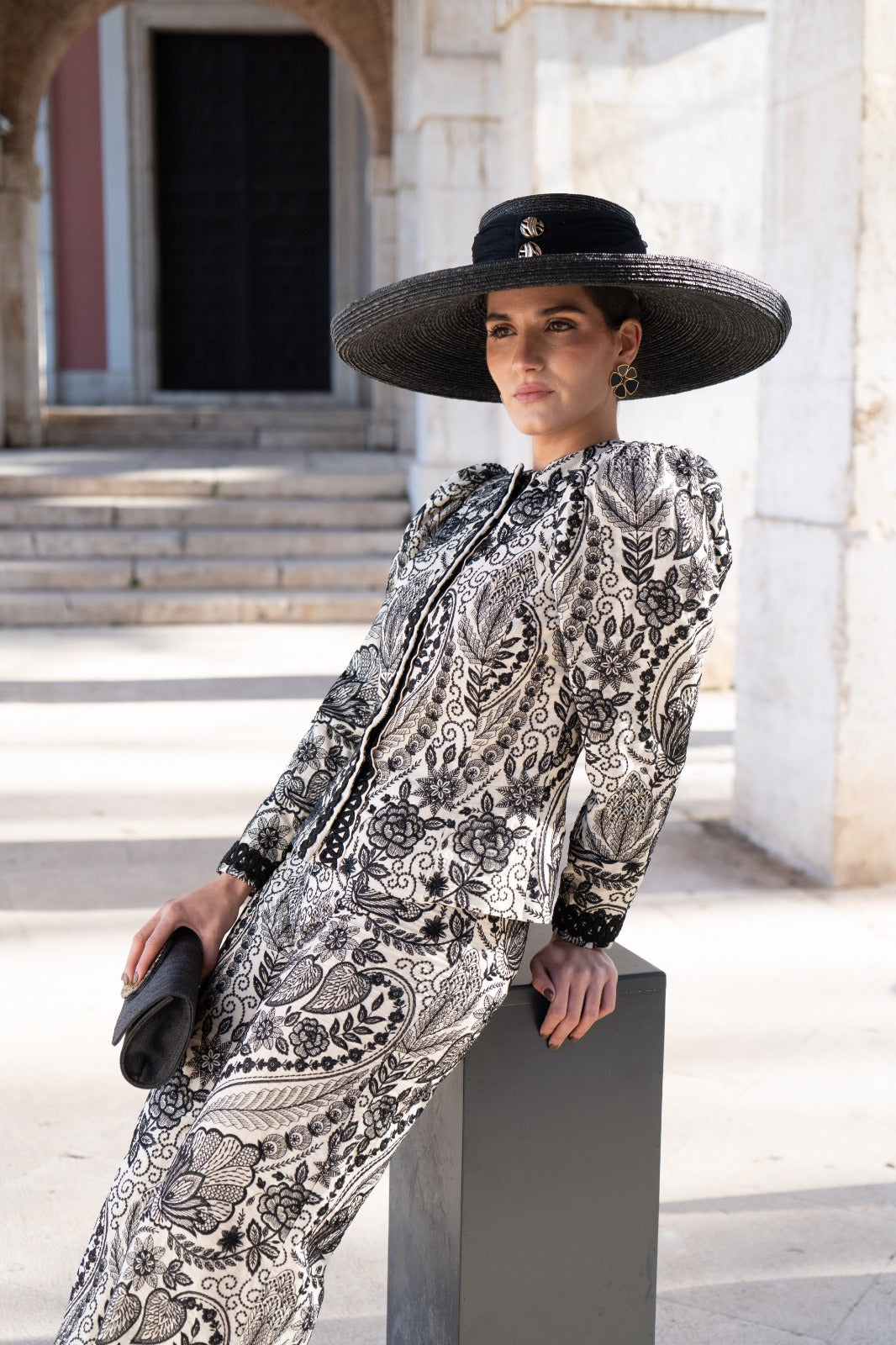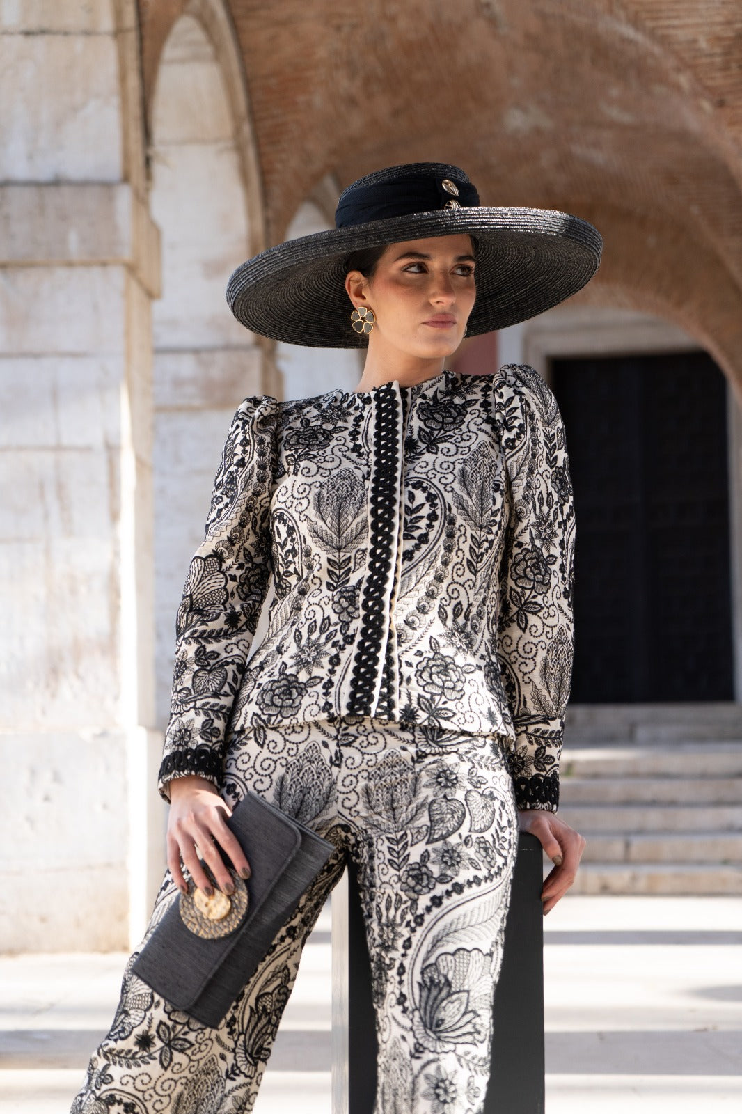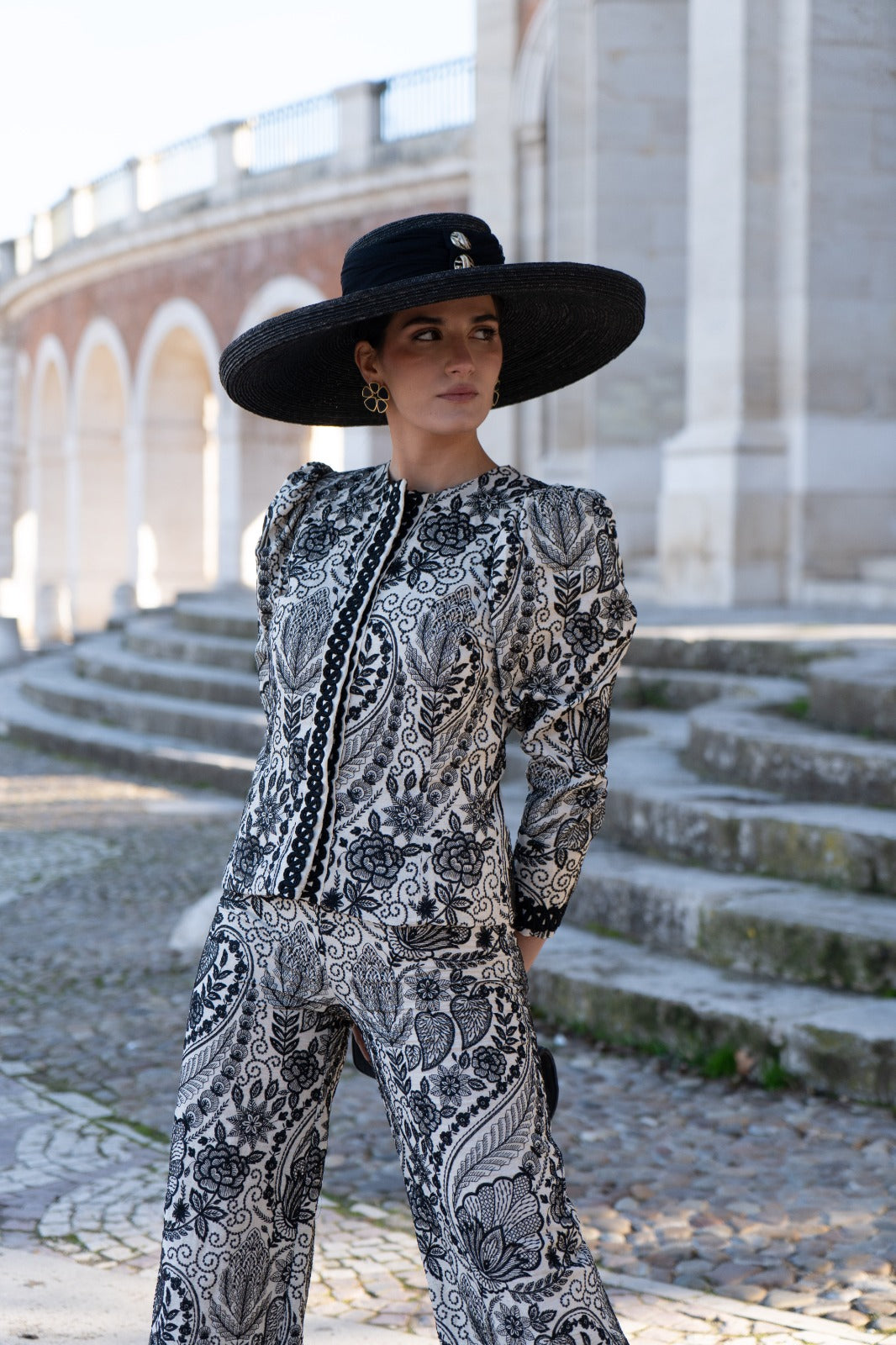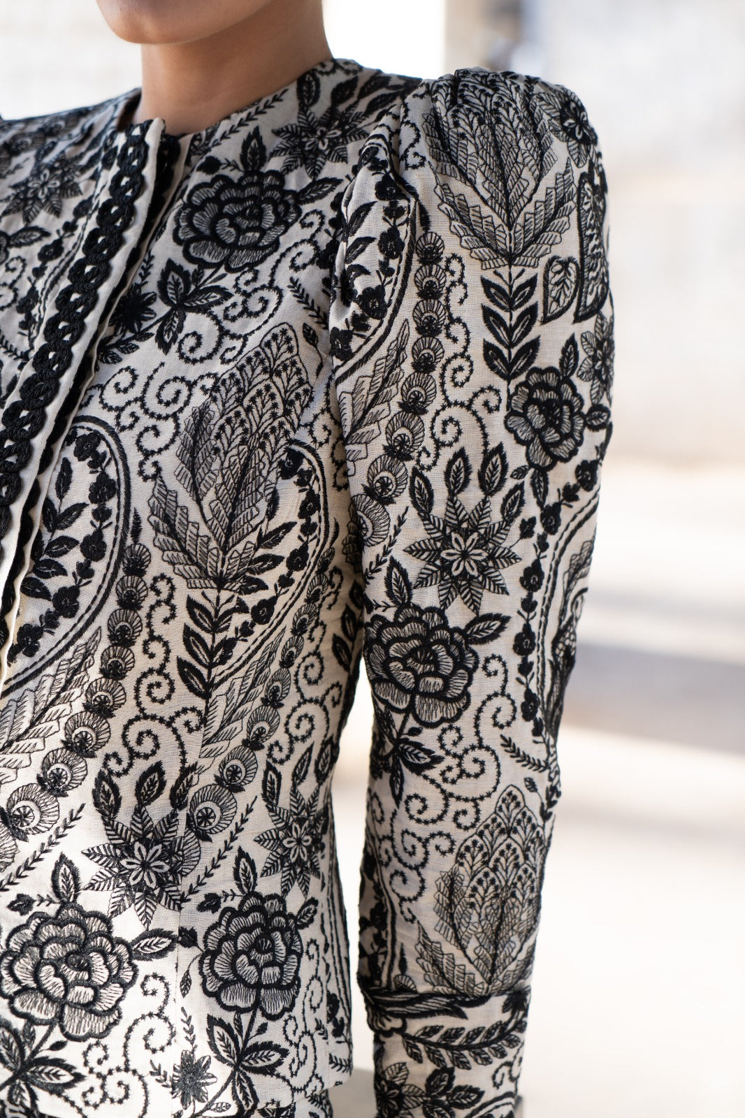This set includes a jacket made from hand-embroidered fabric with a contrasting floral design, slightly structured shoulders, long sleeves, and a tailored fit. The straight-leg trousers flatter the figure, while the fabric's drape provides both comfort and sophistication. Available in beige and black.