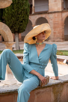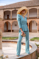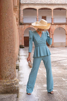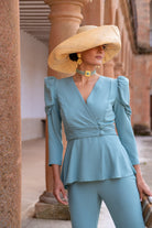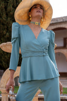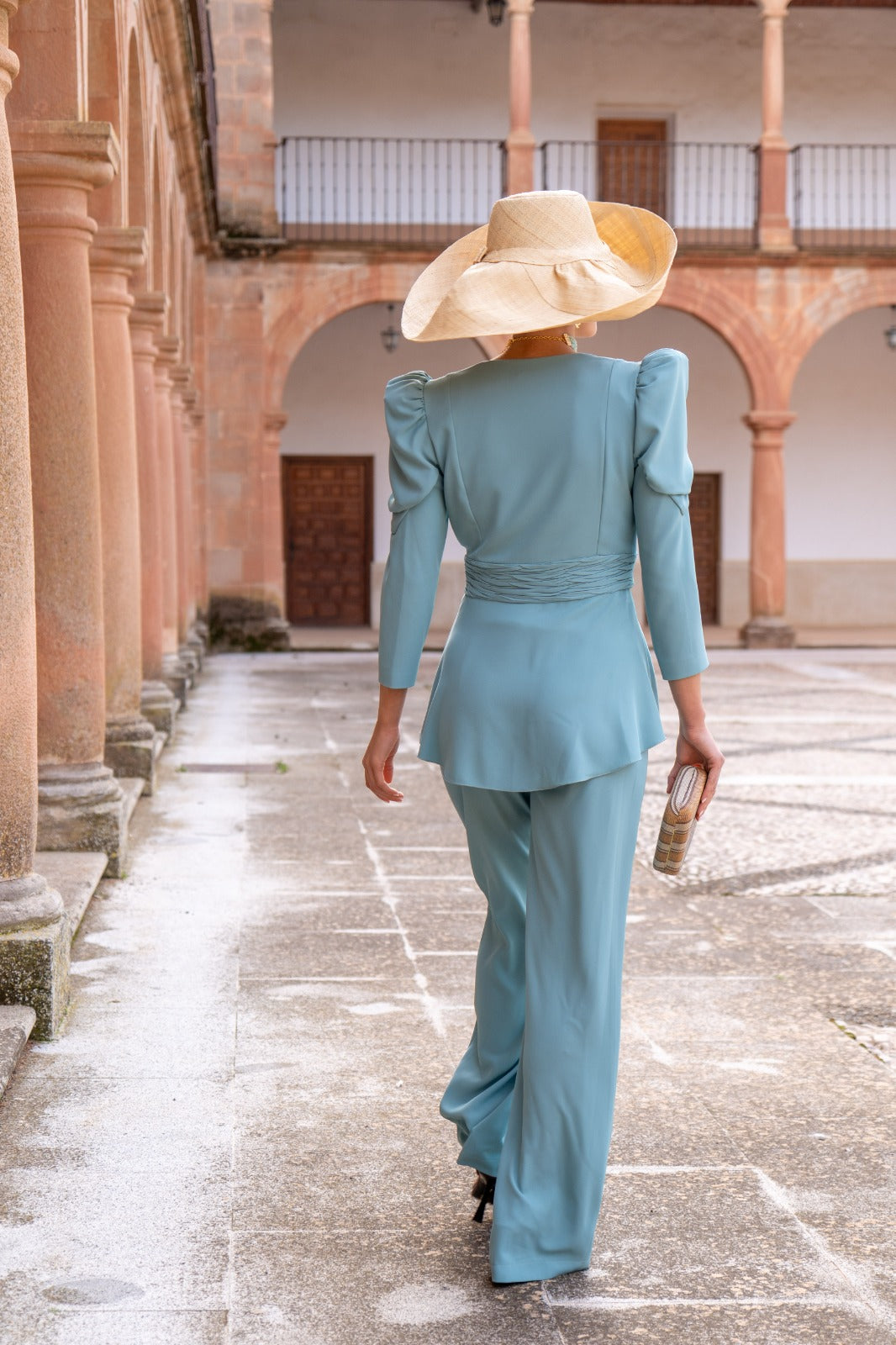 Two-piece set consisting of a double-breasted jacket with buttons, long puffed sleeves, and high-waisted pants with a side zipper in blue.