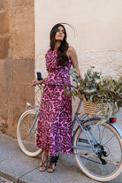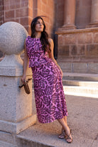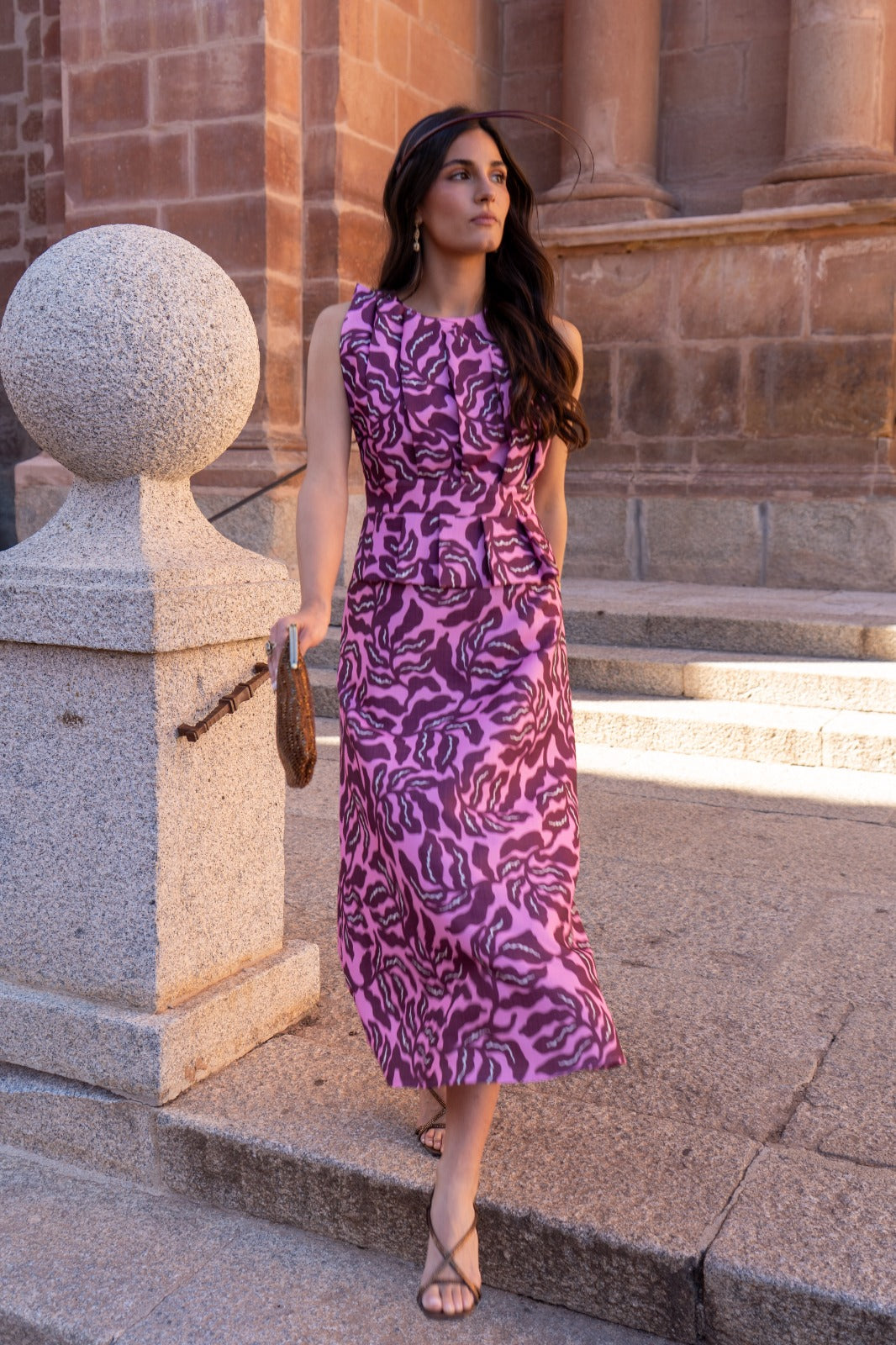 Midi dress, round neckline, sleeveless, cut at the waist, flared hem. In printed color.