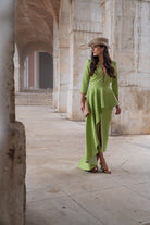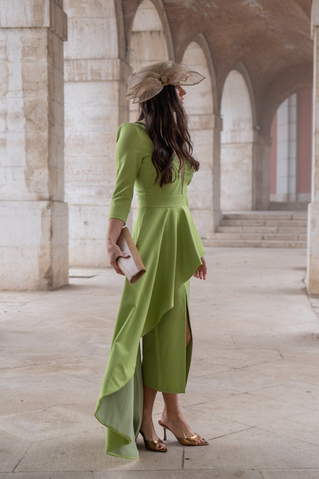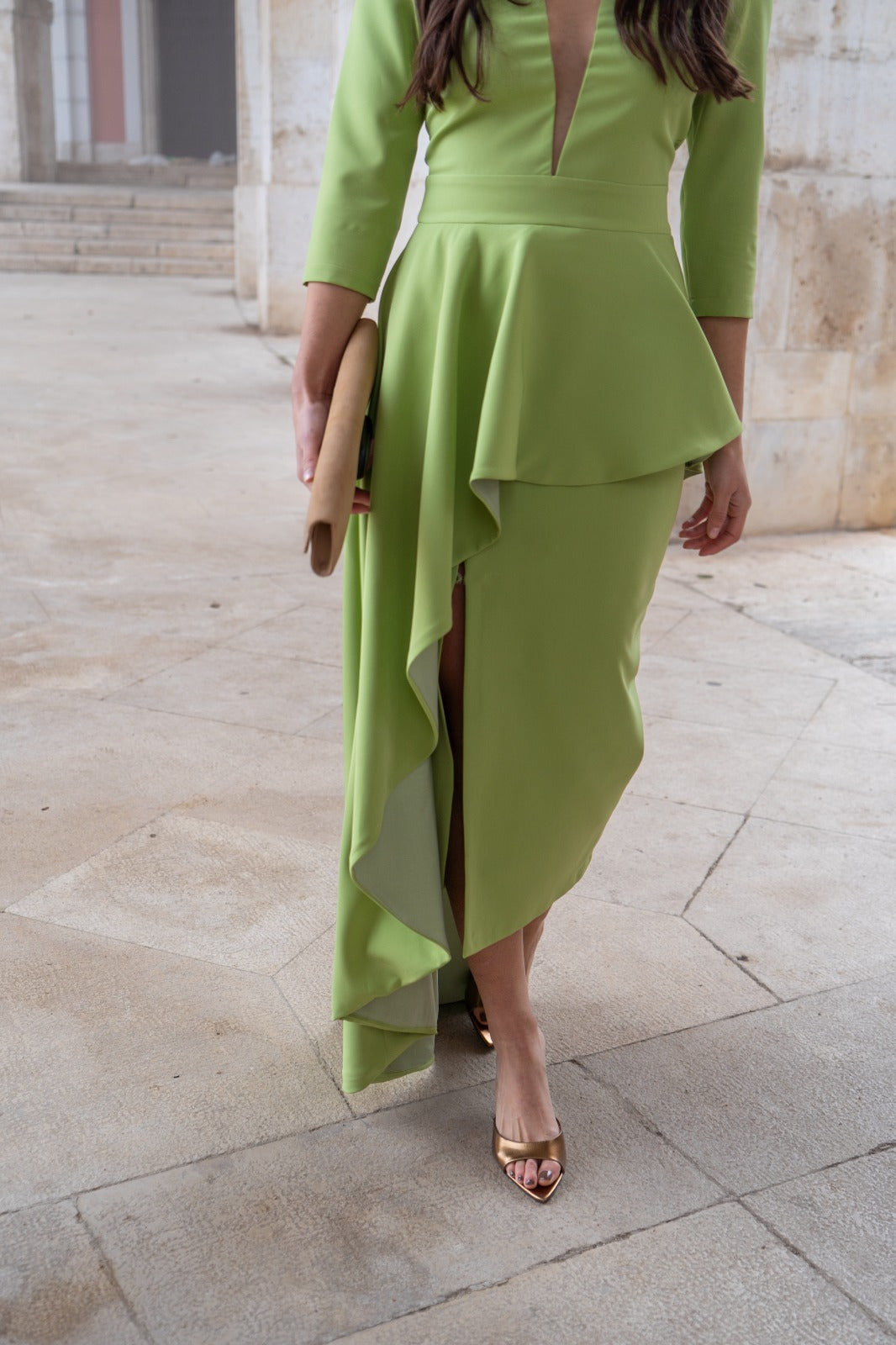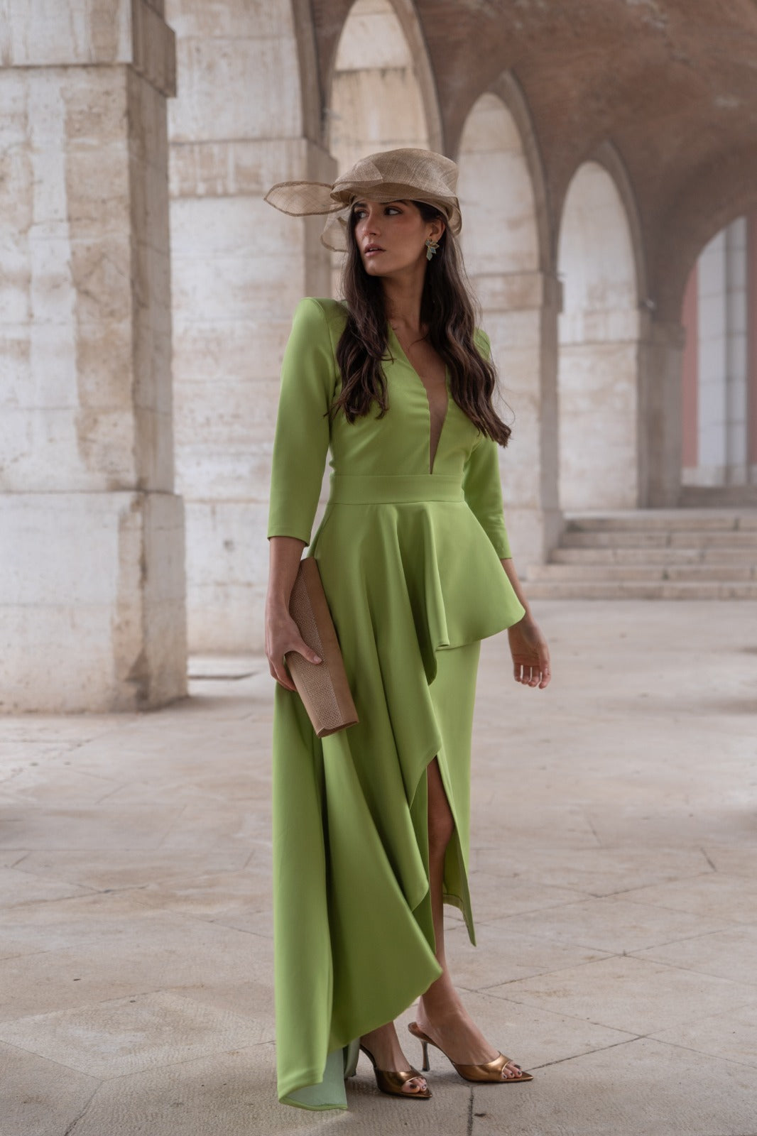 Midi dress, V-neck with detail at the neck, three-quarter sleeves, front slit, over a long side skirt with peplum. In green.