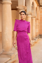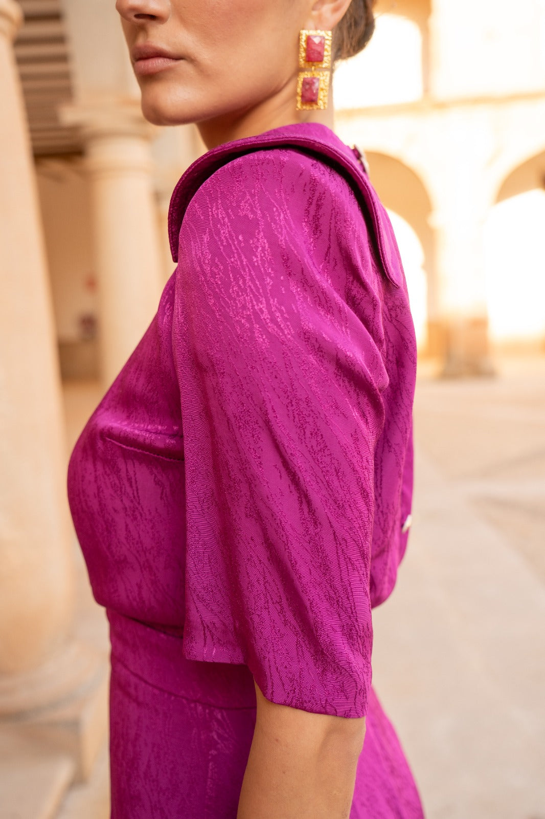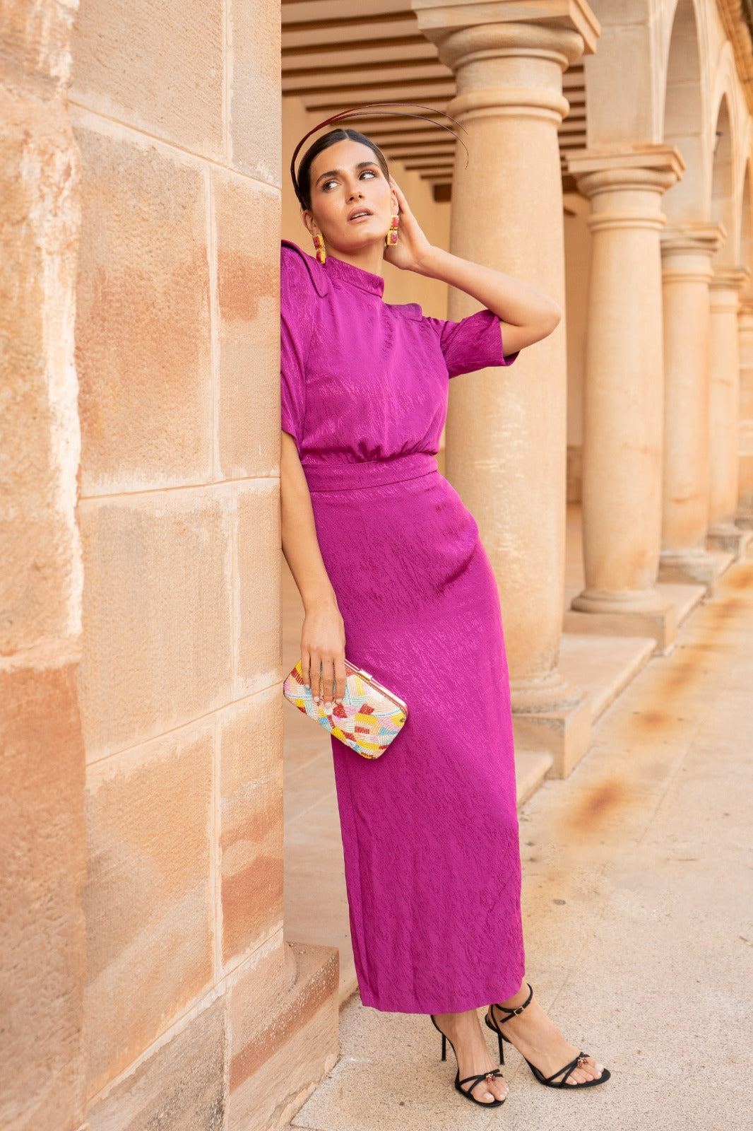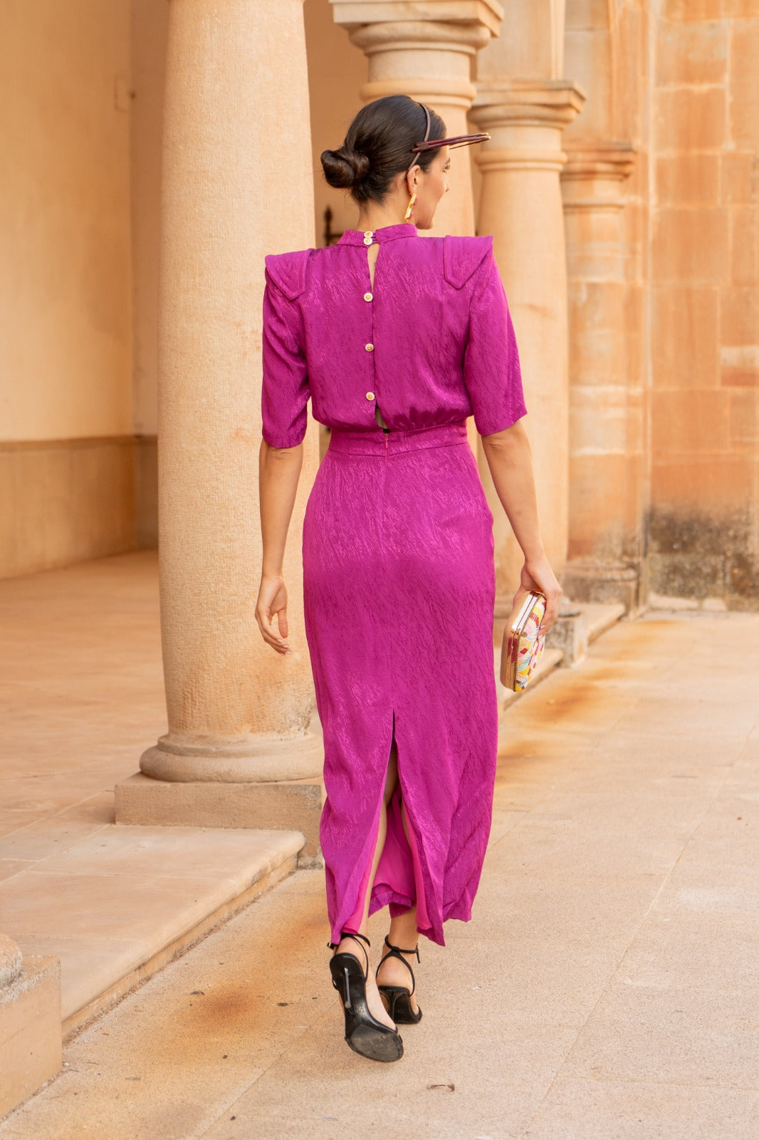 Midi dress, round neckline, short sleeves, pronounced shoulders, waist cut, back slit. In bougainvillea color.