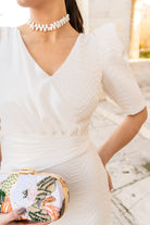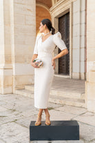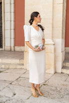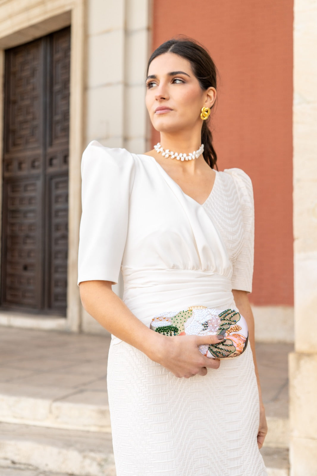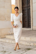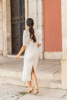 Midi dress, V-neck, short puff sleeves, combination of fabrics with a fitted waist. In beige with gold lurex.