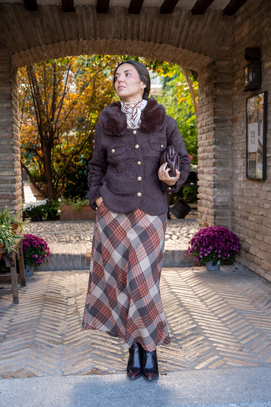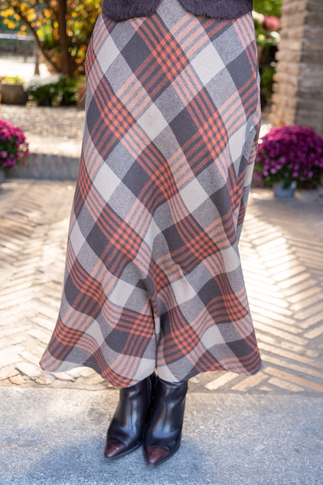 Midi skirt, waist with side zip and elastic at the back, side pockets. In brown, beige and orange plaid.