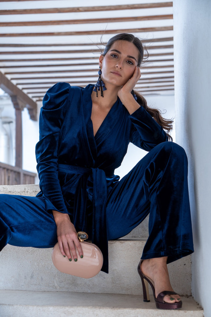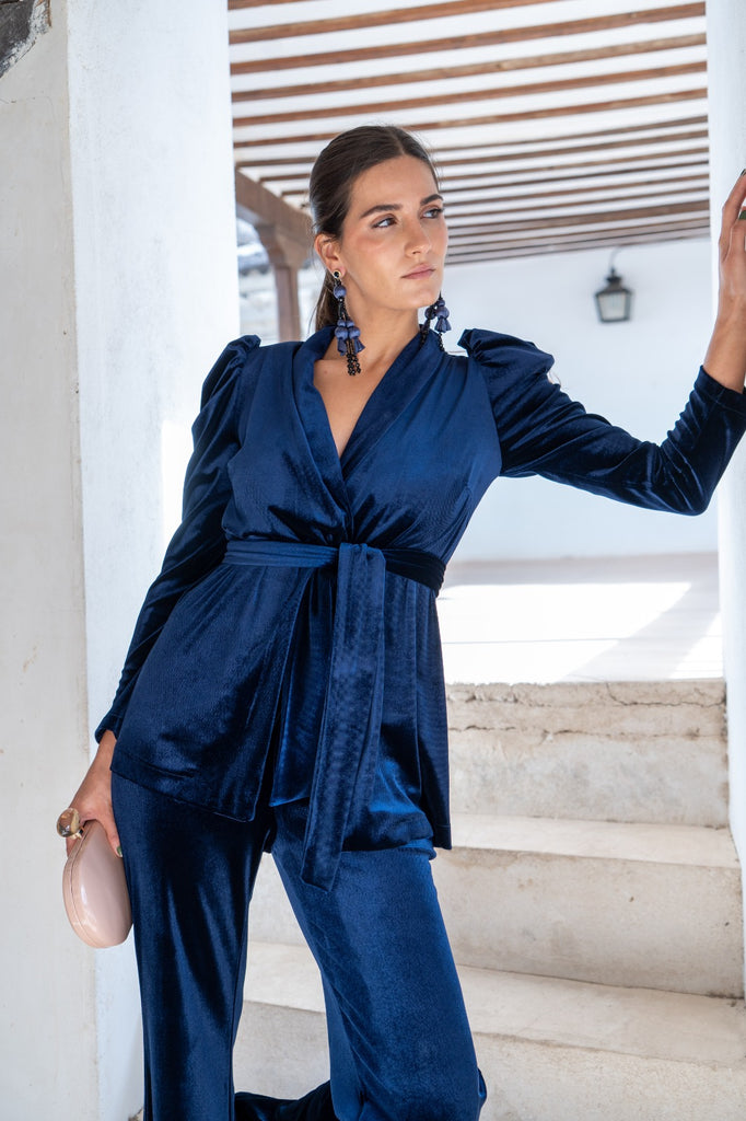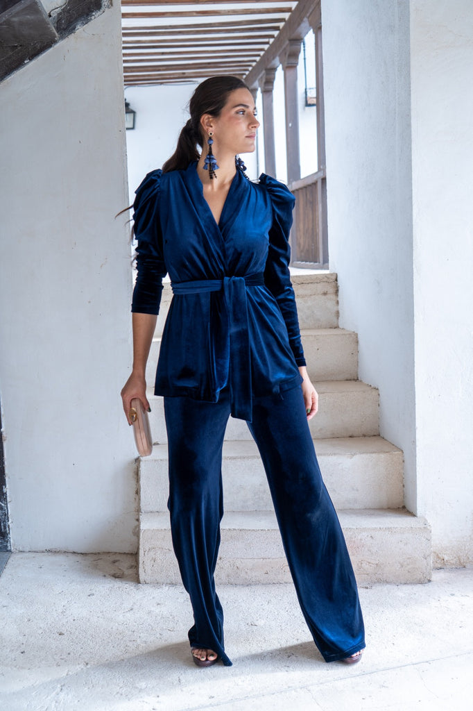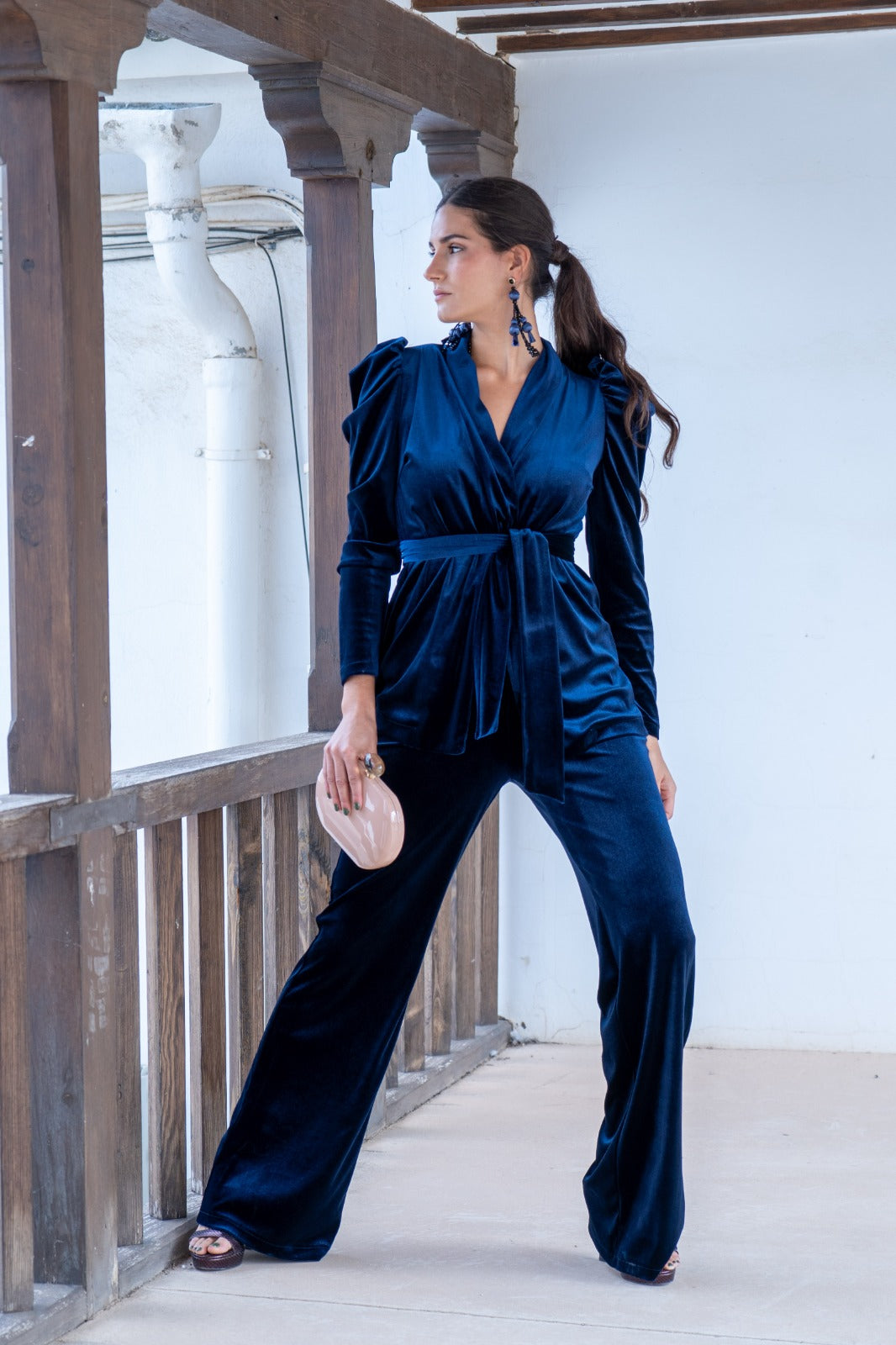 A-line suit consisting of a double-breasted jacket with belt, long puff sleeves, and wide-legged high-waisted trousers. In blue velvet.