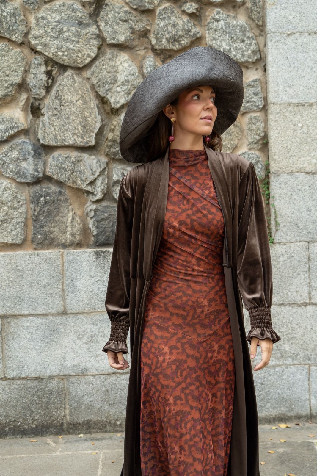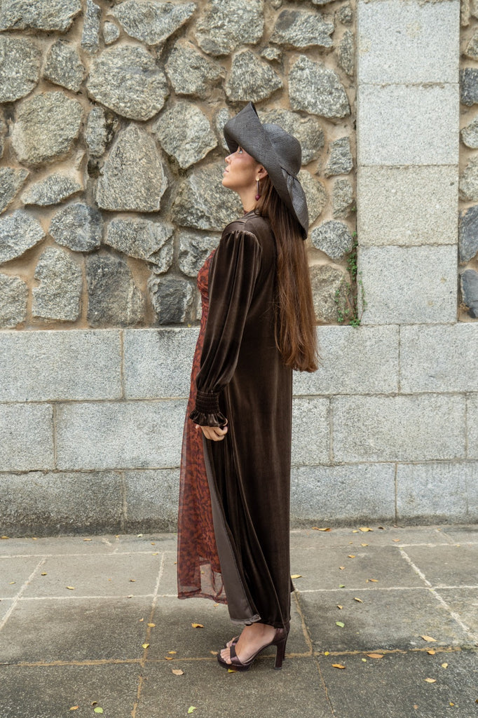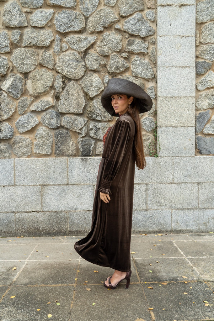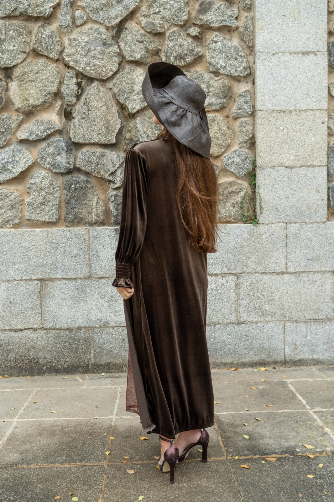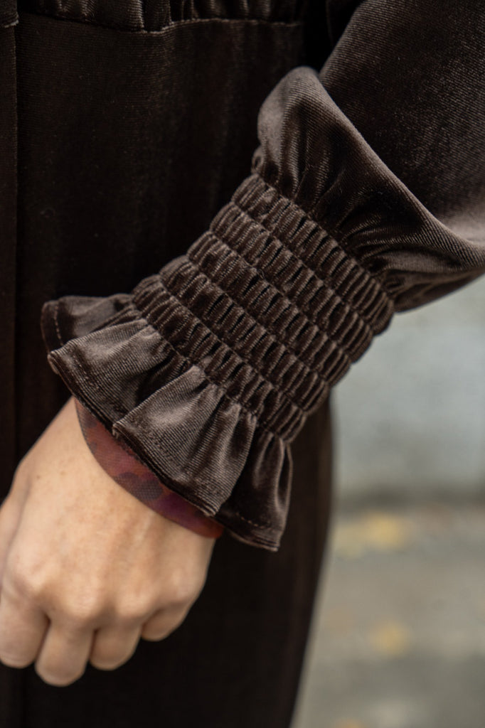 Velvet coat, gathered sleeves with shoulder pads, elasticated cuffs. In brown.