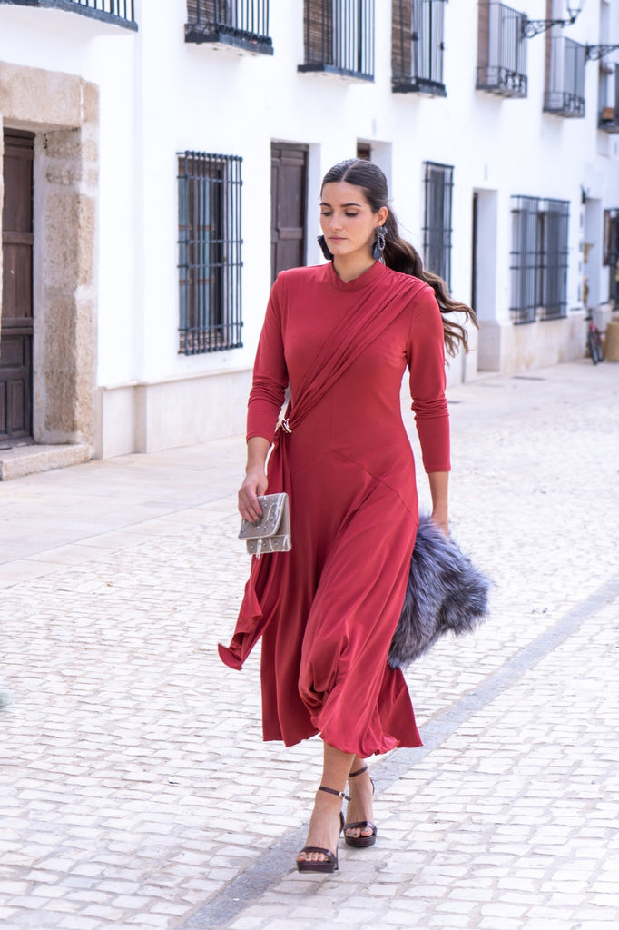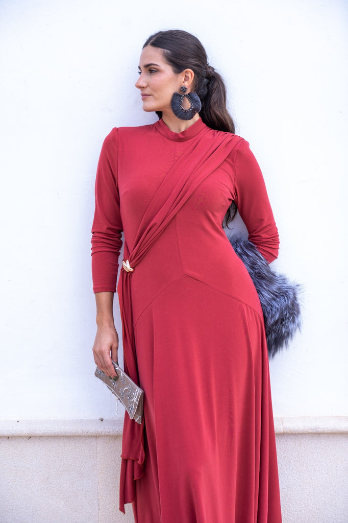 Midi dress, high neck, long sleeves, brooch detail on one side with a crossover strap, flowing skirt. In rust-colored silk knit.