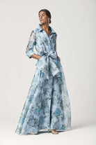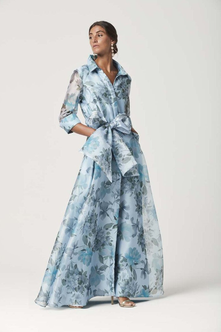 Long dress, shirt collar, three-quarter sleeves in chiffon with cuffs, fully buttoned at the front, side pockets, maxi bow at the waist. In blue with a floral print.