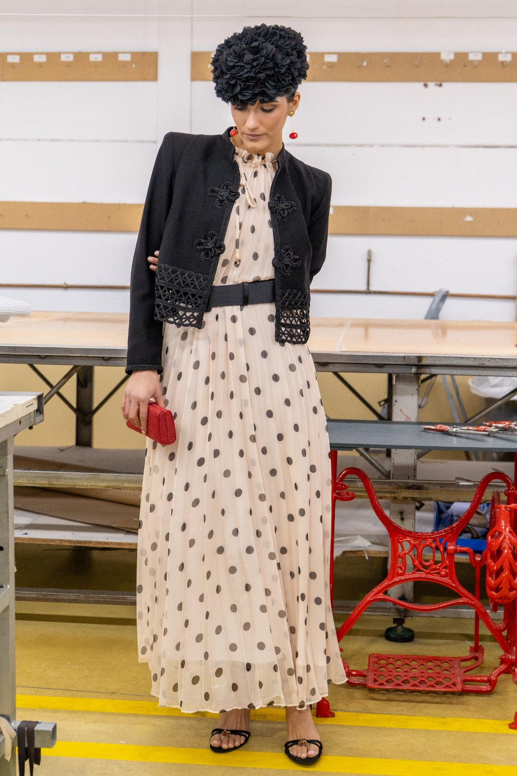 Short black jacket with toggle closure detail, mandarin collar, long sleeves, and guipure hem. In black.