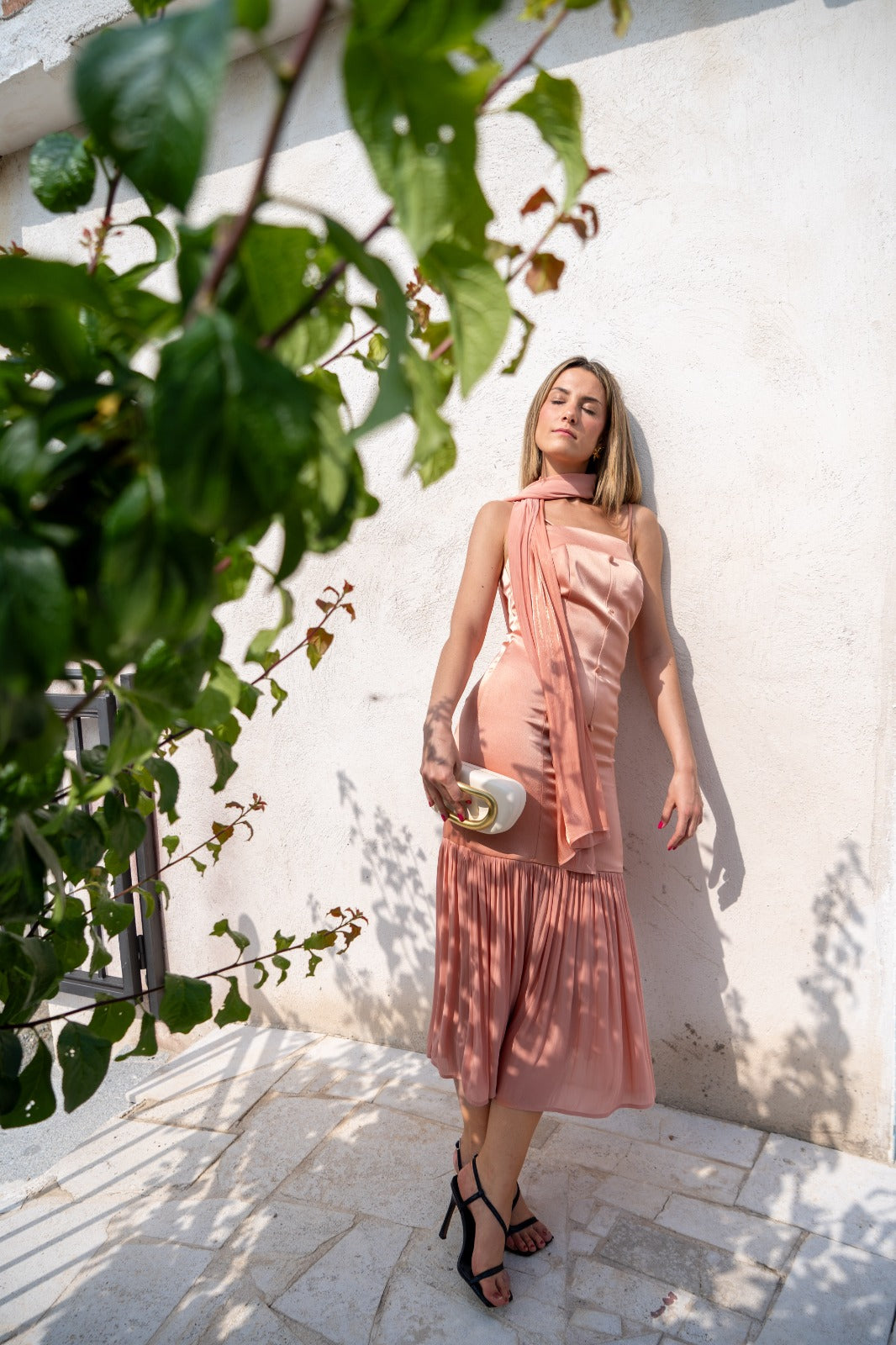 Midi dress with a narrow shoulder pad, square neckline, front buttons, pleated ruffle at the bottom, and a scarf included. In coral.