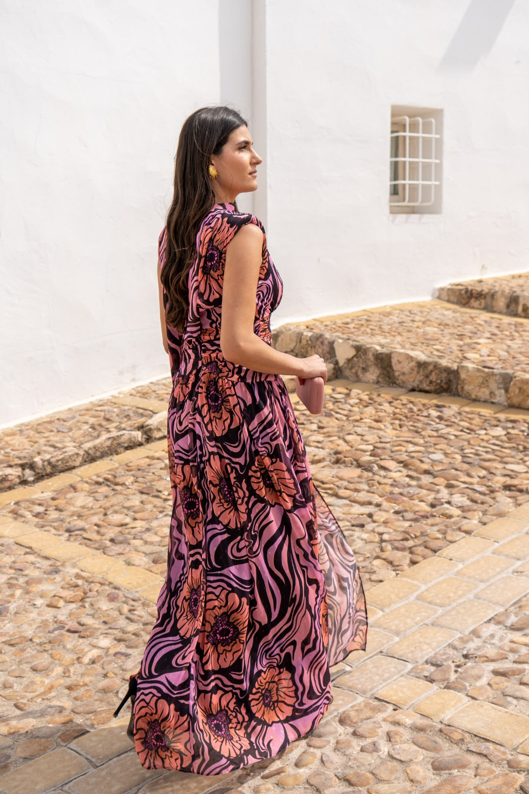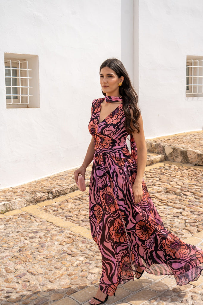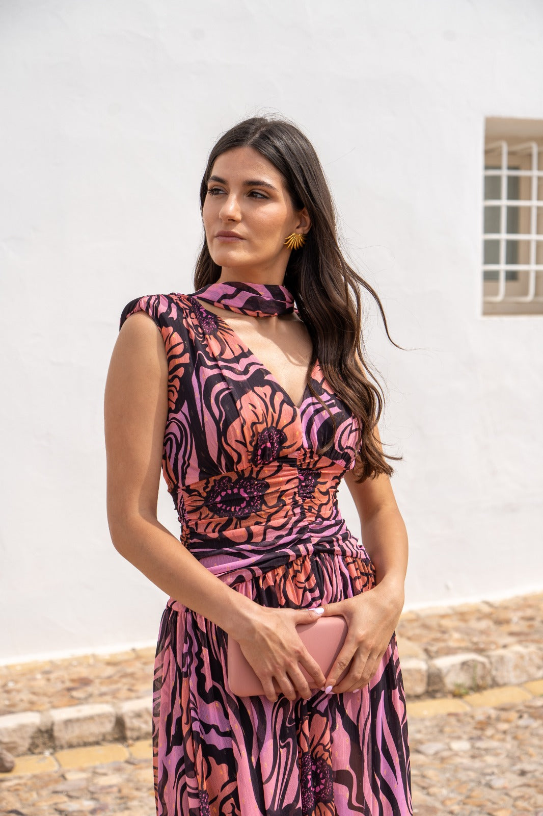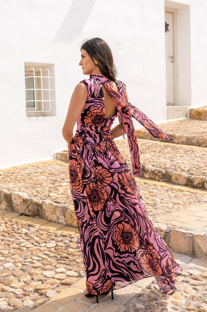 Long dress with a V-neckline at the front and back, sleeveless, gathered waist, and front slit. Multicolored print.