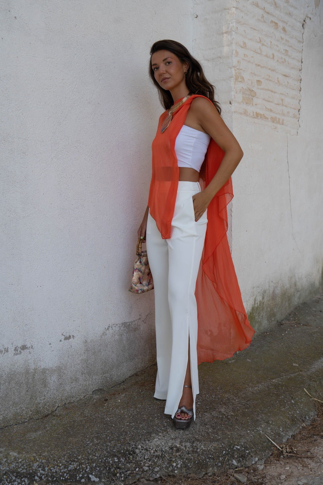 Long, wide-legged trousers with a side slit and side pockets. In white.