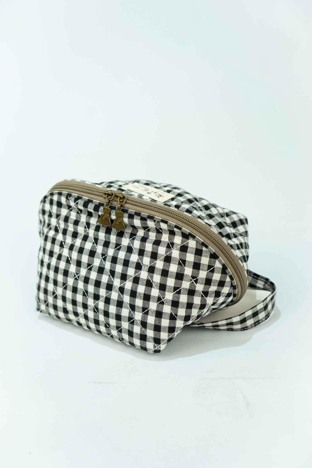 Toiletry bag with zip closure, handle on one side, in black and white gingham.