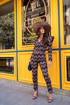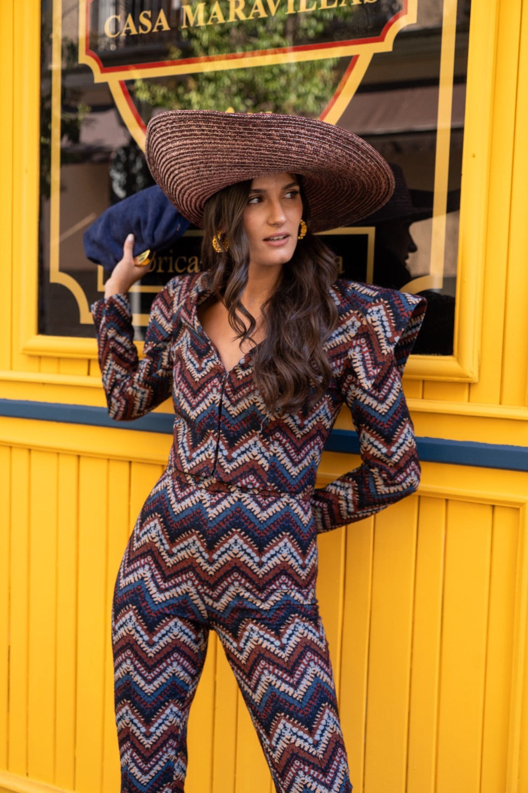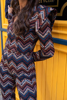 Set consisting of a long-sleeved jacket with shoulder flaps, a V-neck, and a front button closure, paired with high-waisted, slim-fit trousers. Multicolor print.