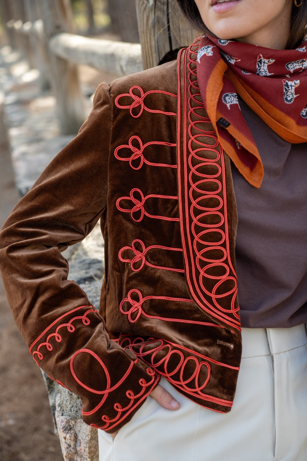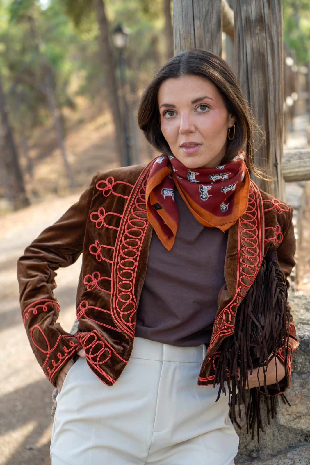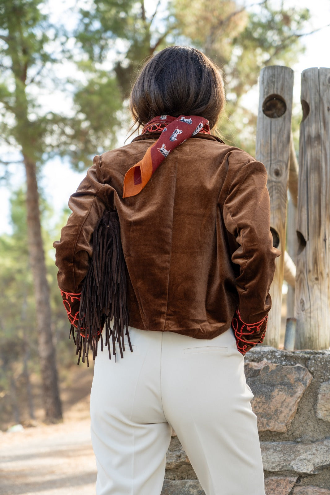 Short jacket, shawl collar, long sleeves, button closure at the bottom, in brown suede with orange embroidery.