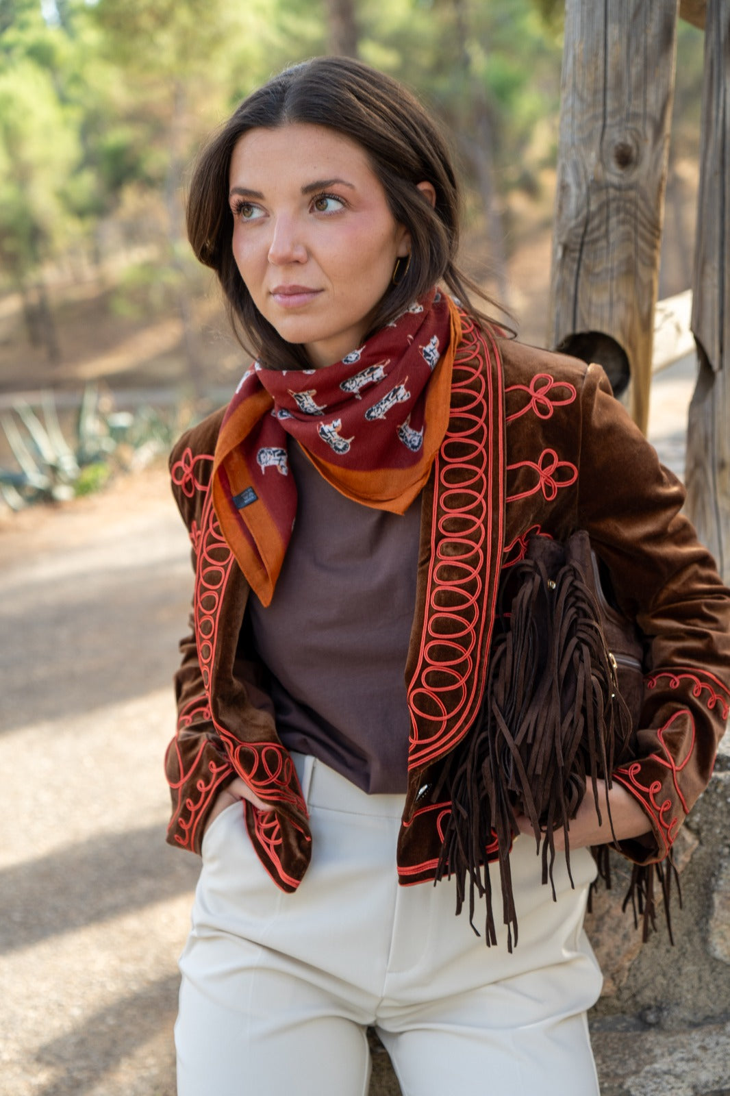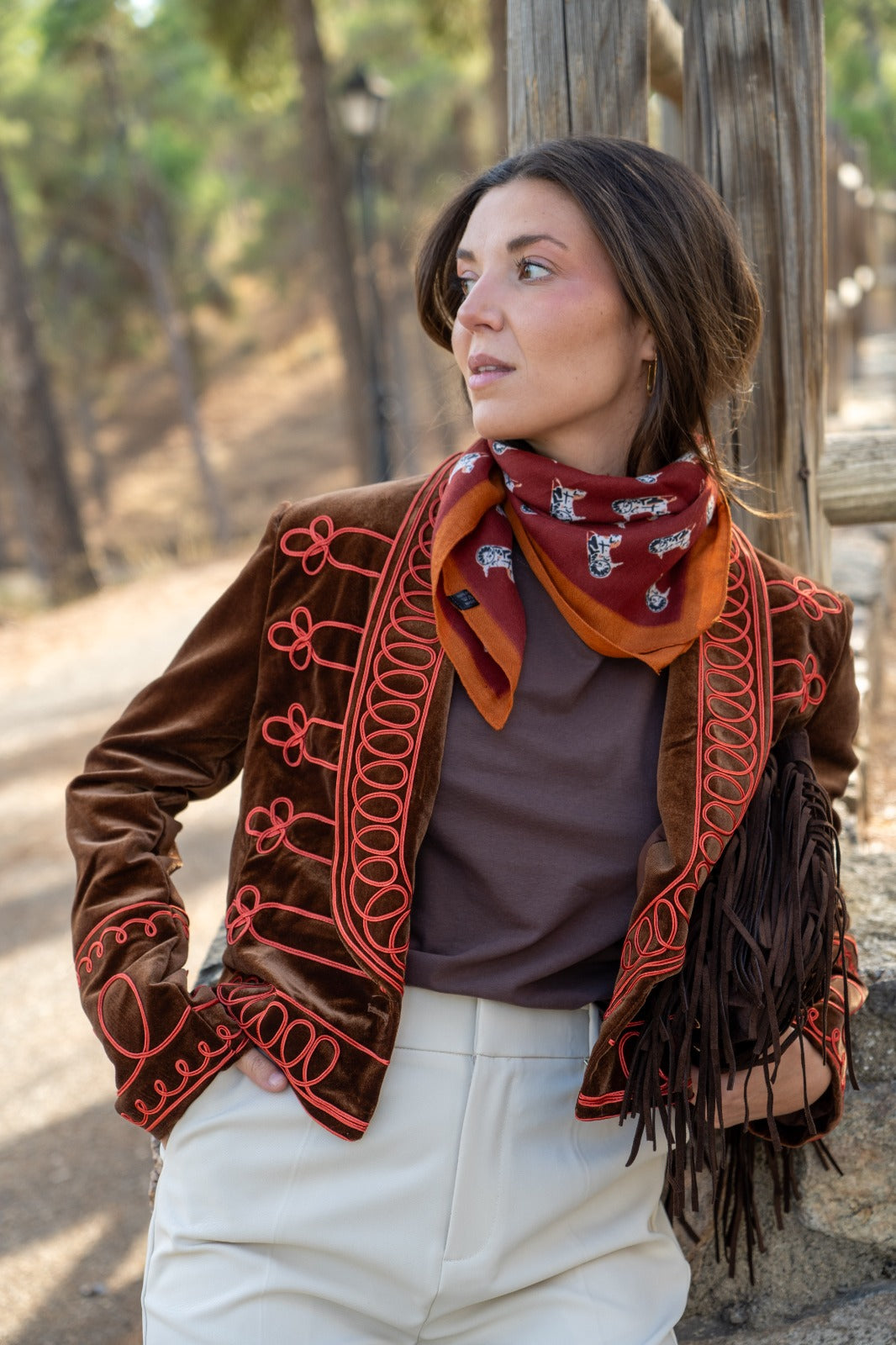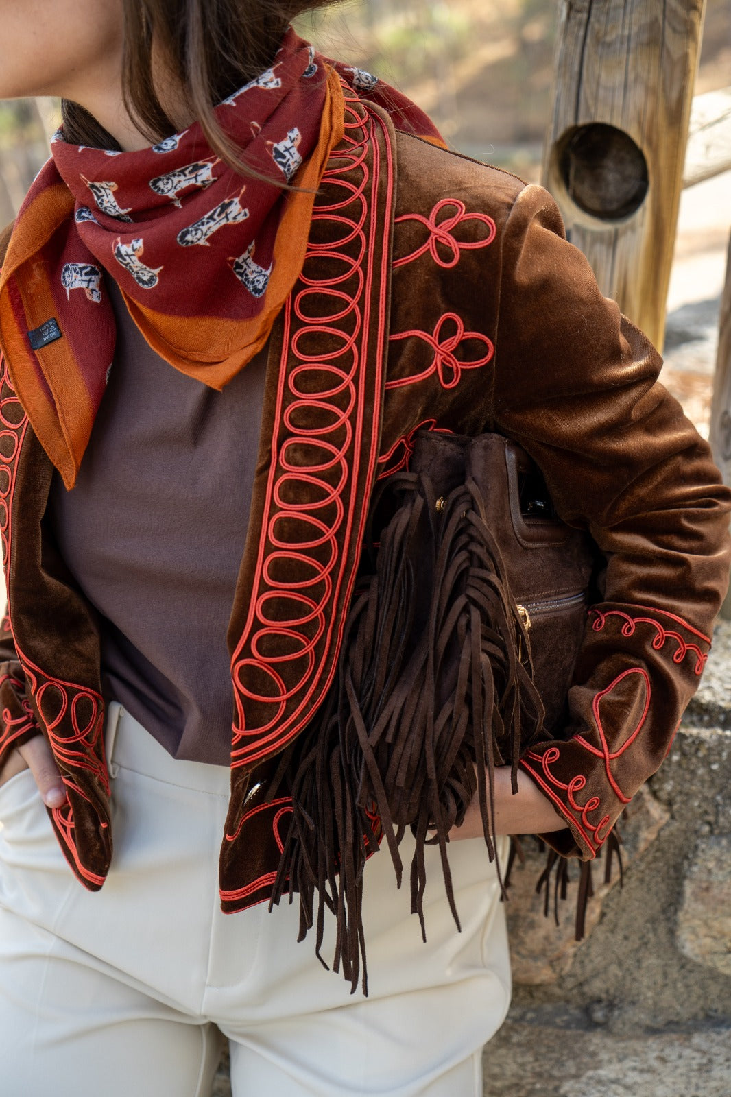 Short jacket, shawl collar, long sleeves, button closure at the bottom, in brown suede with orange embroidery.