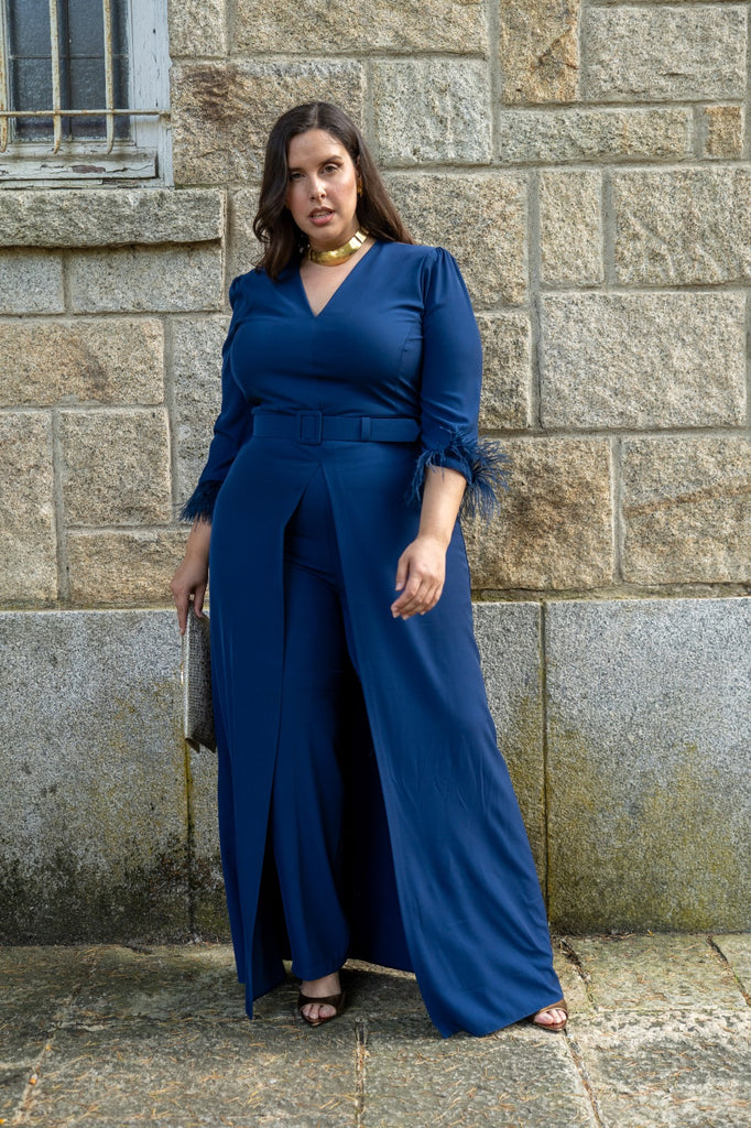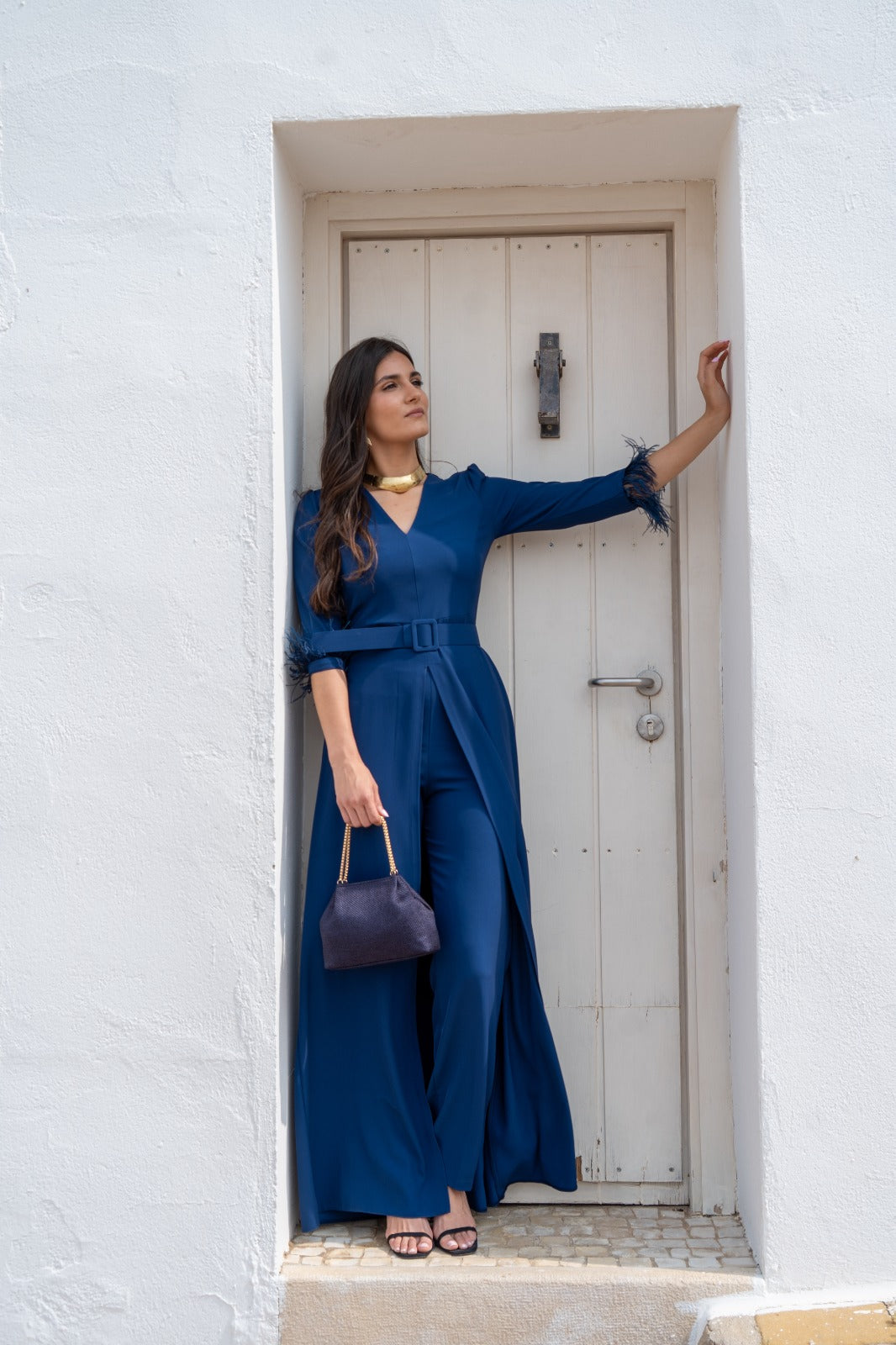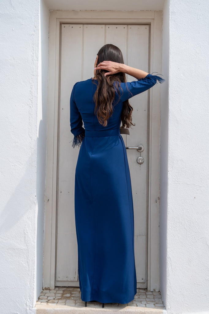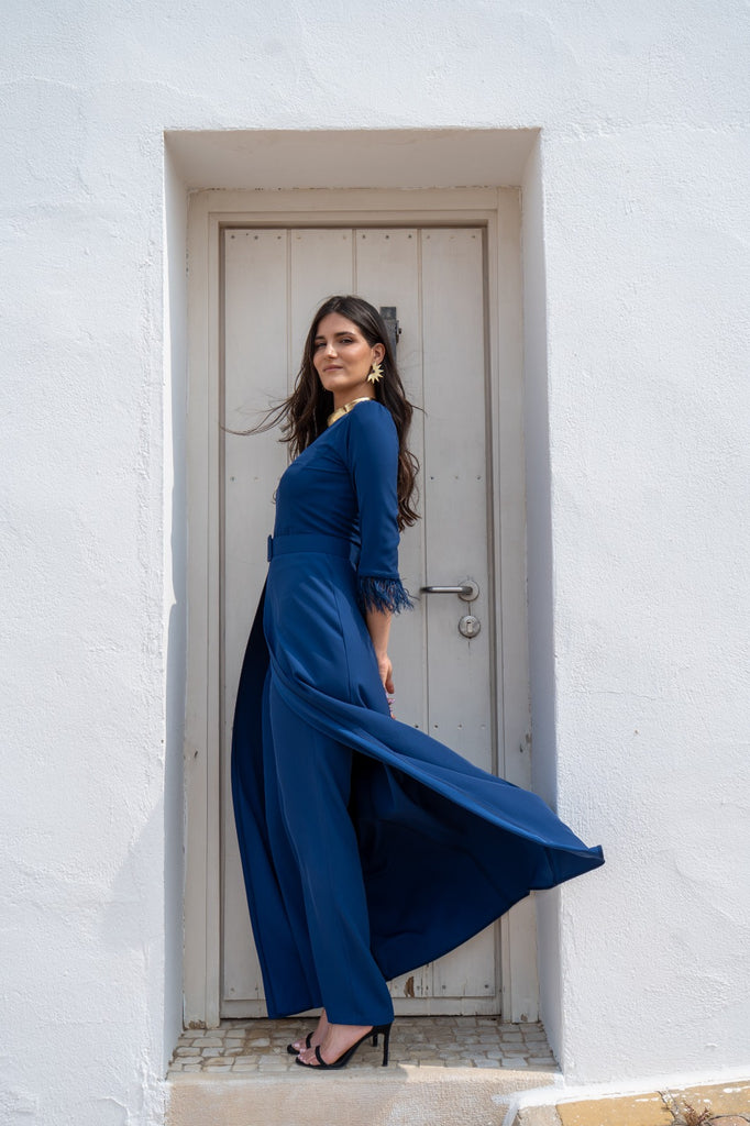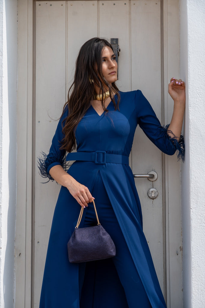 Set consisting of a long frock coat with a V-neck, three-quarter sleeves with feathers, a front vent, and trousers with a waistband, back zipper, and a narrow hem. In navy blue.