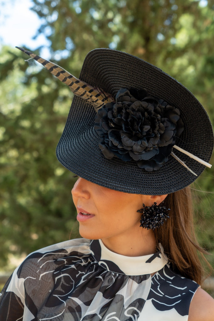 Headpiece with polyester base, with flower and feather detail, with headband for fastening, in black.