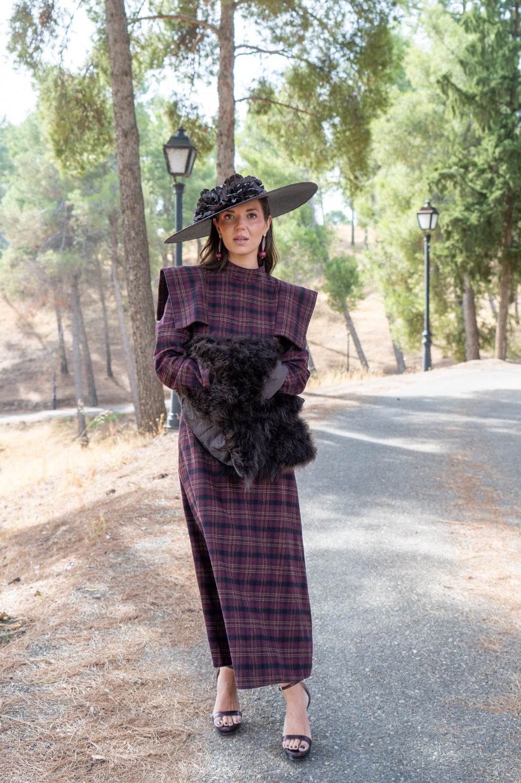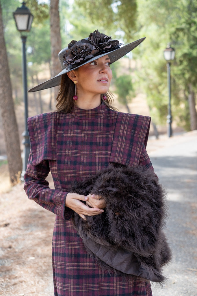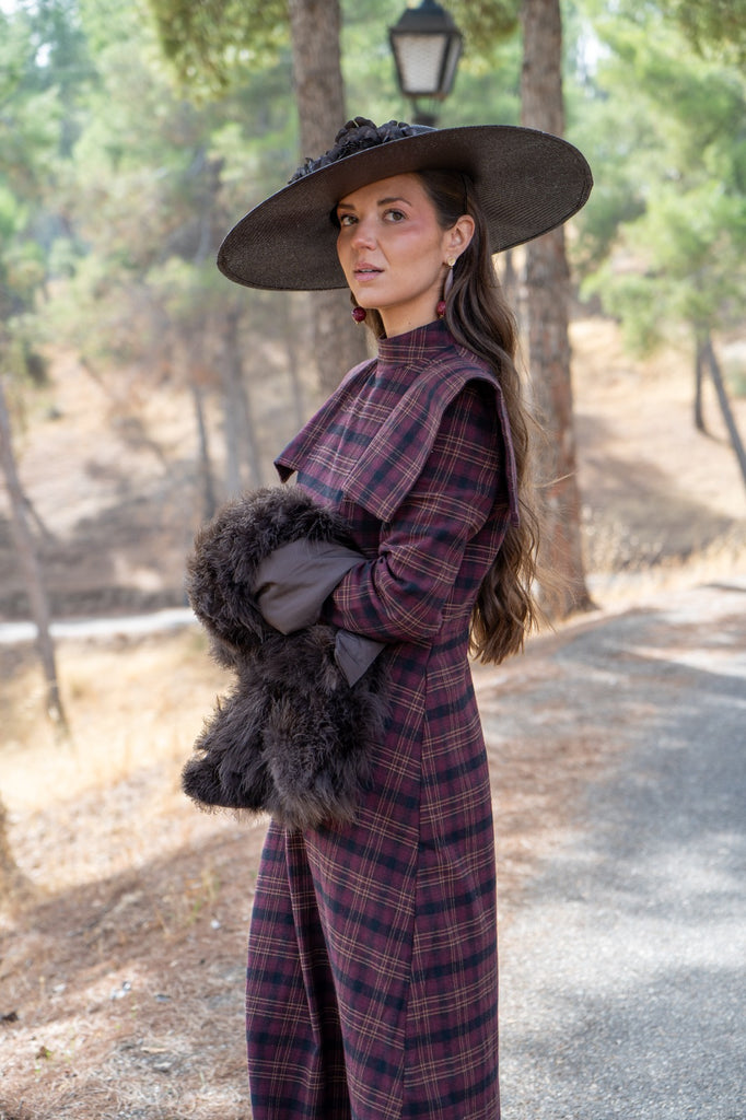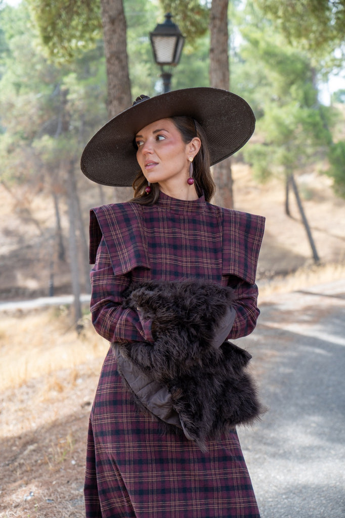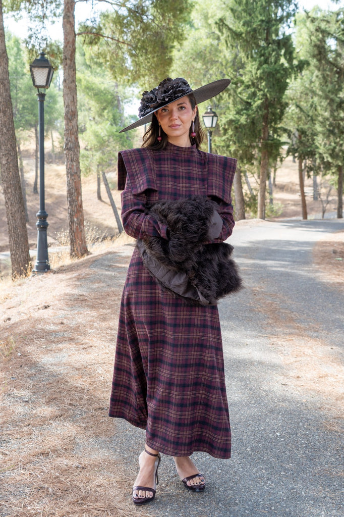 Midi dress, high neck, shoulder spoiler, waist cut, in burgundy and green checks.