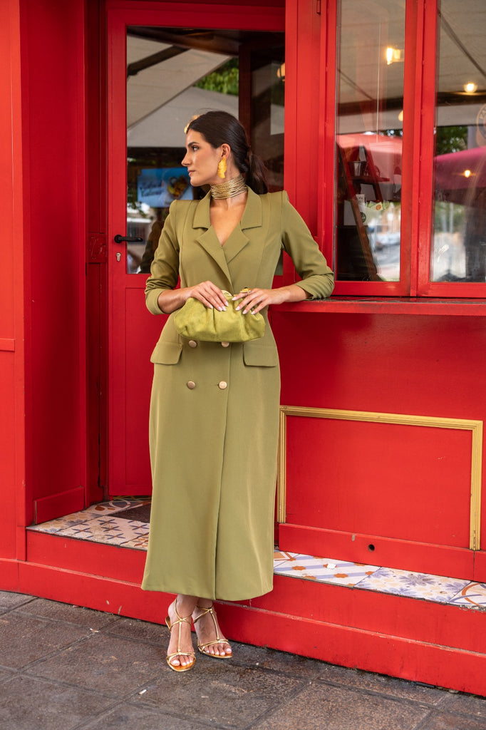 Midi dress with a crossover neckline and lapels, double-breasted and buttoned, and pocket flap detail. In green.