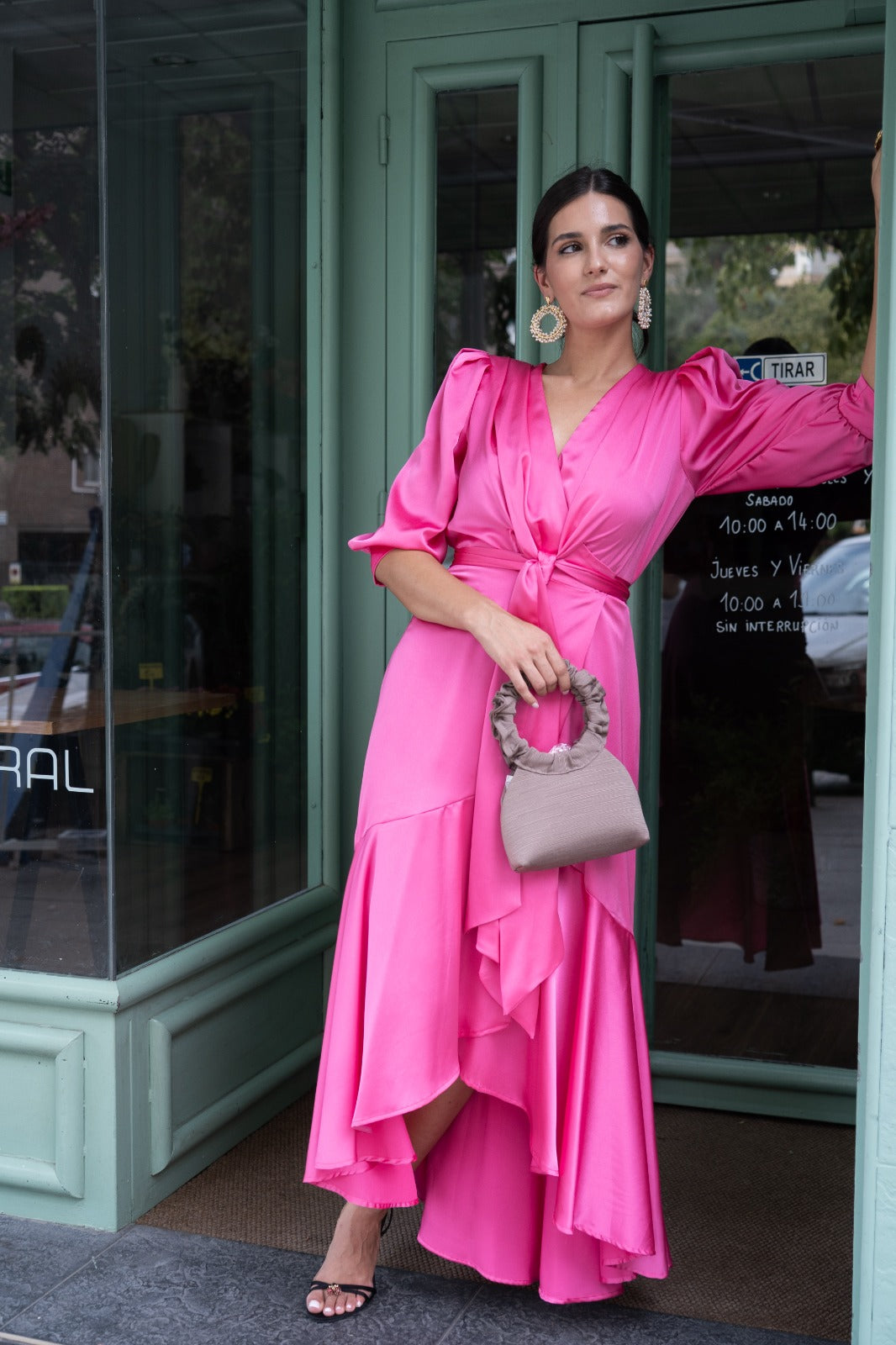Flowing midi dress with a knotted wrap, half sleeves and cuffs, shaped at the front, longer at the back. In pink.