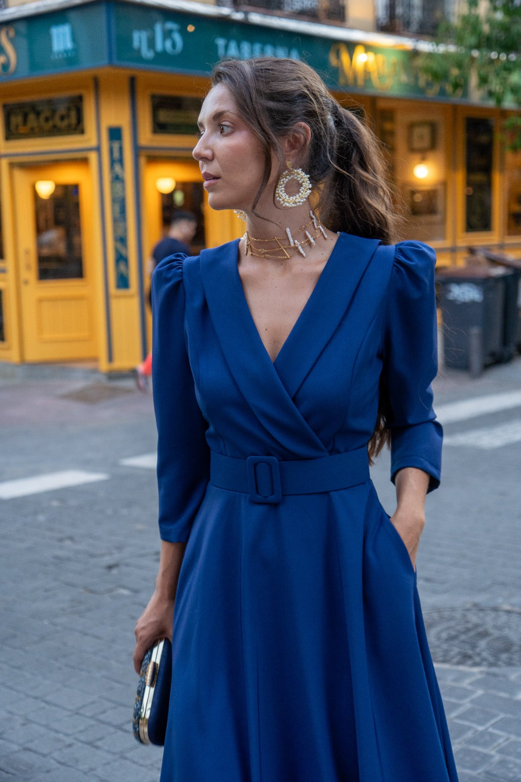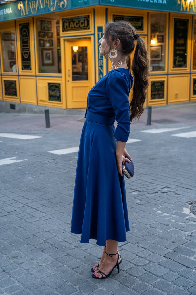 Midi dress with a crossover neckline and lapel collar, three-quarter sleeves, a belt, a full skirt, and pockets. In navy blue.