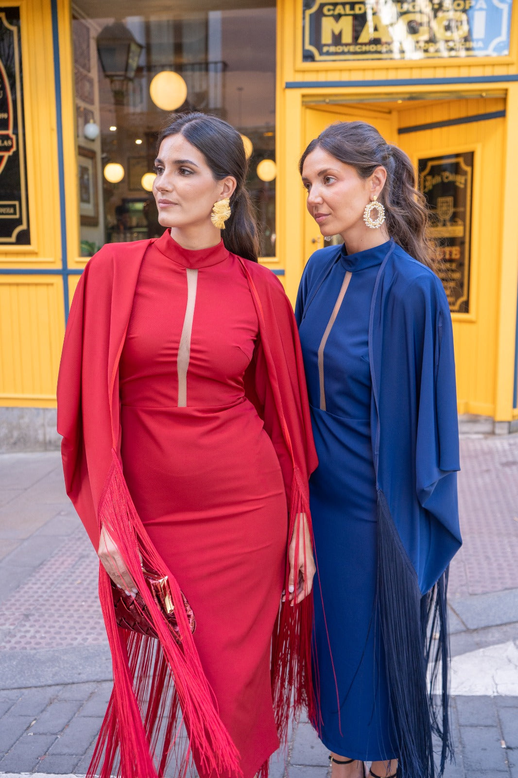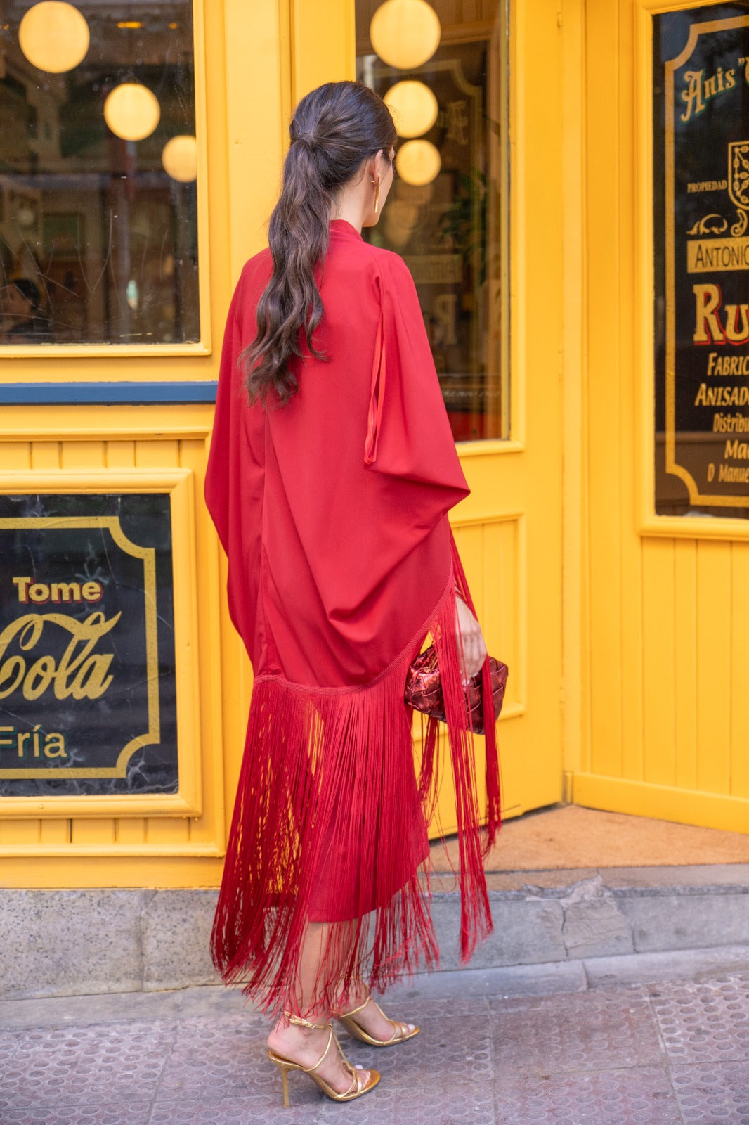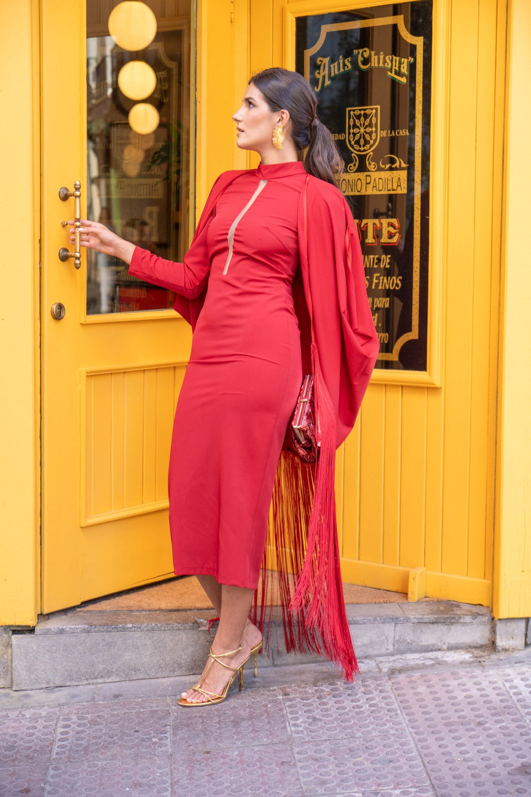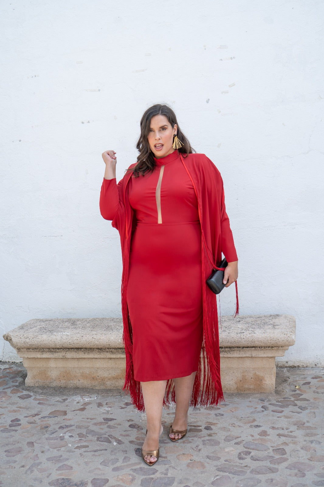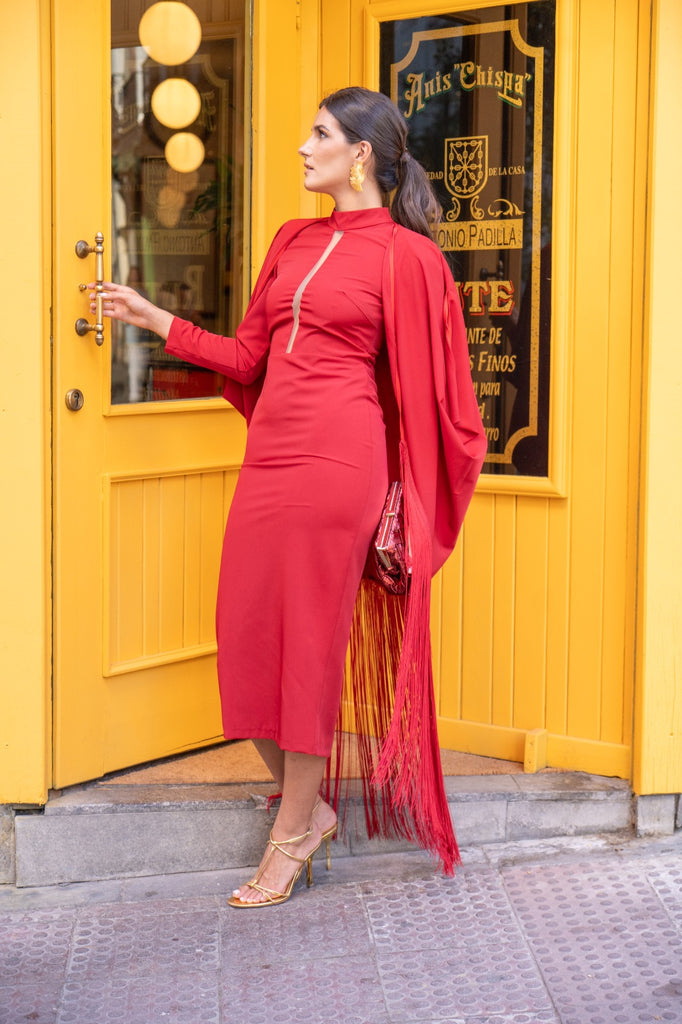 Midi dress with a high round neckline and sheer strap, three-quarter sleeves, a back slit, and a fringed kaftan with a sash. In red.