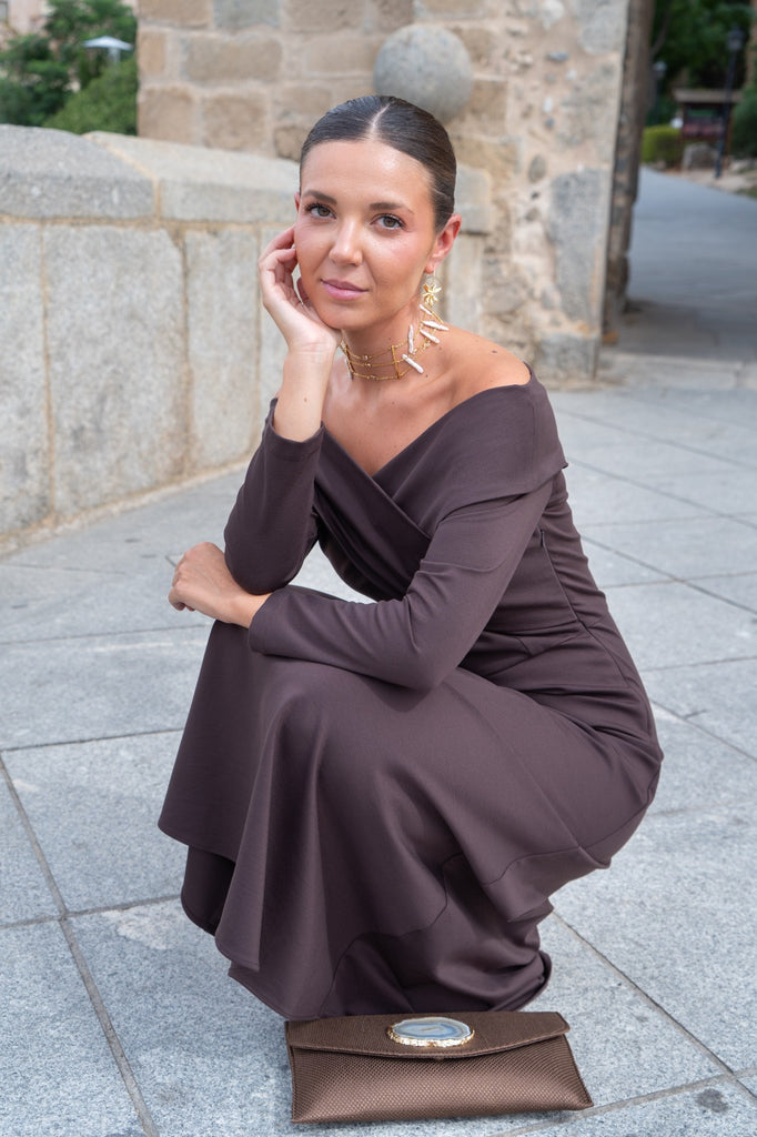 Midi dress, Bardot crossover neckline, long sleeves, flared A-line skirt. In chocolate brown.