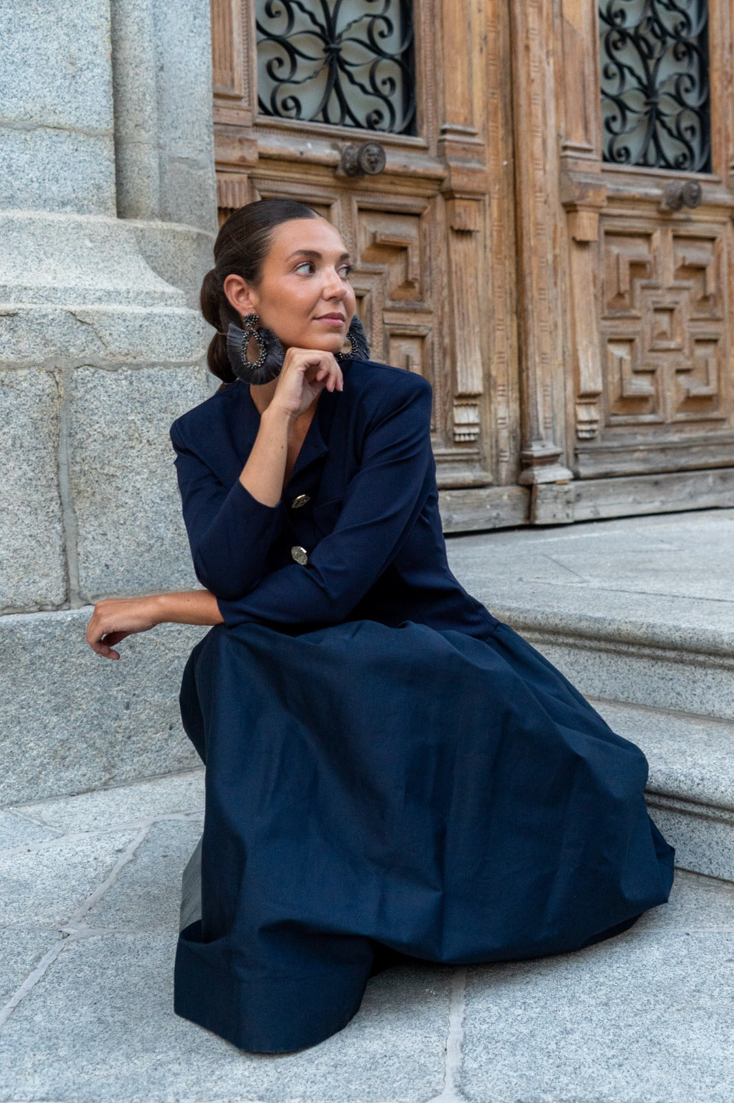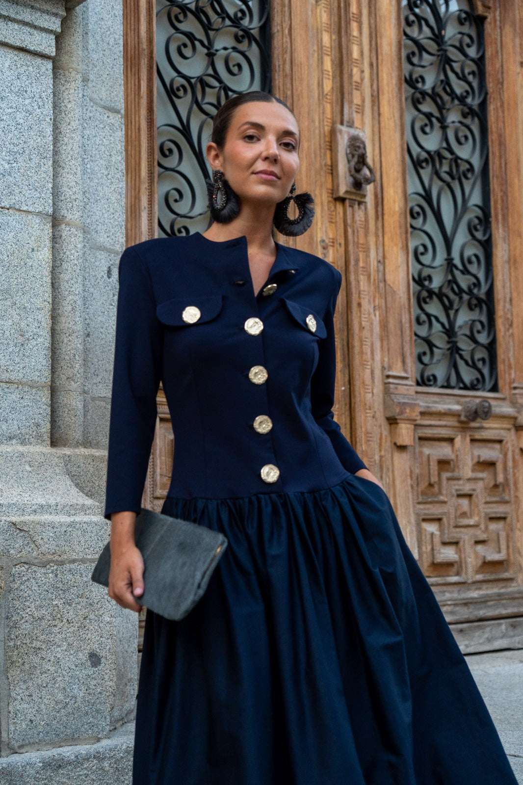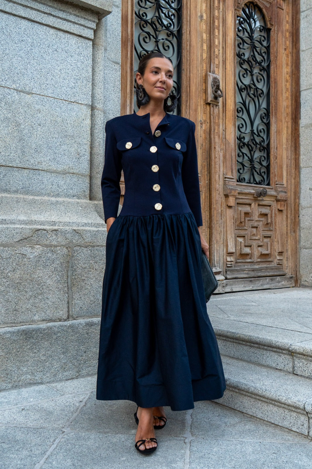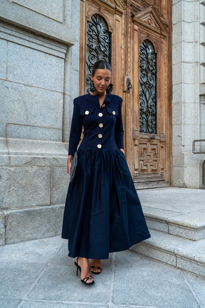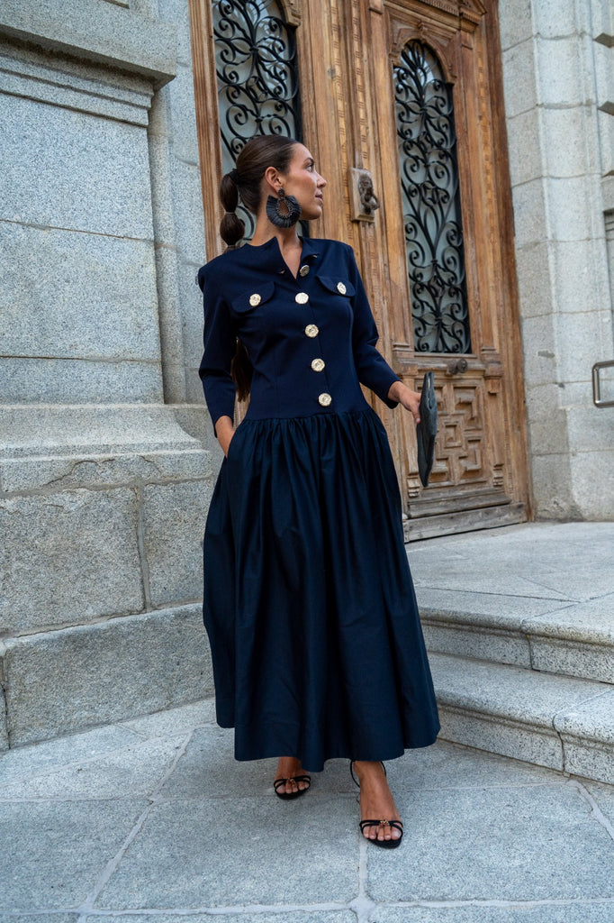 Midi dress, round neckline, buttoned, three-quarter sleeves, full skirt, side pockets. In blue.