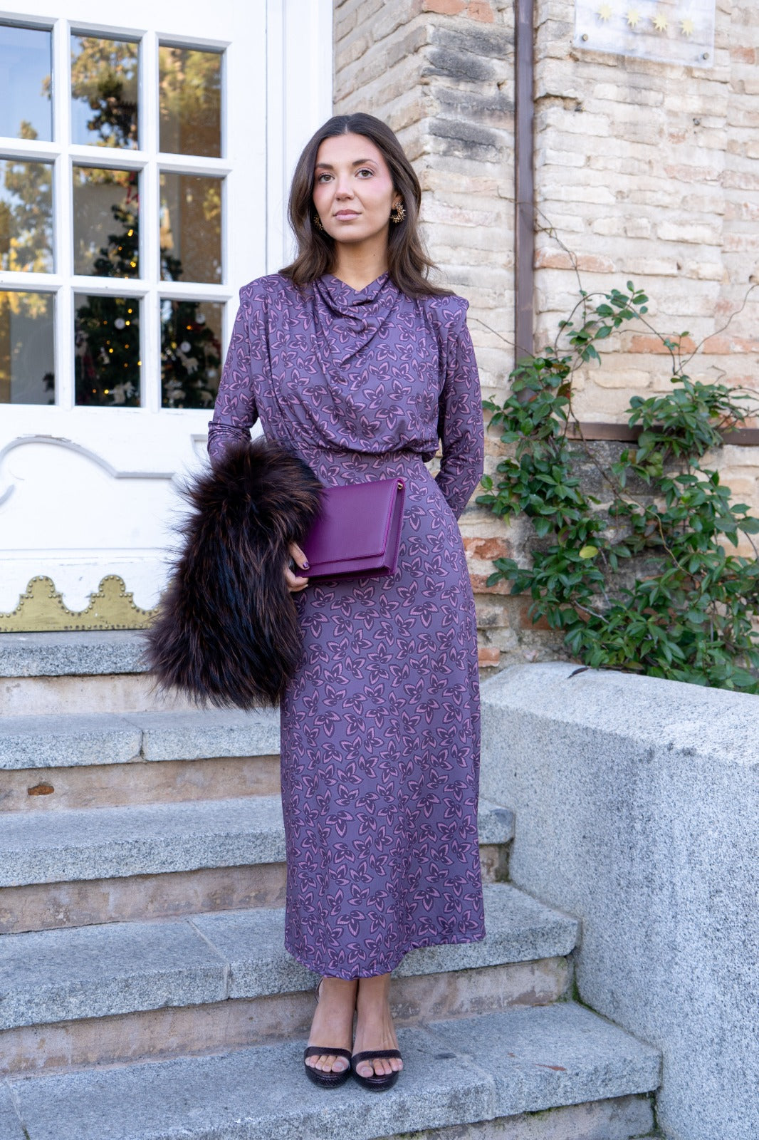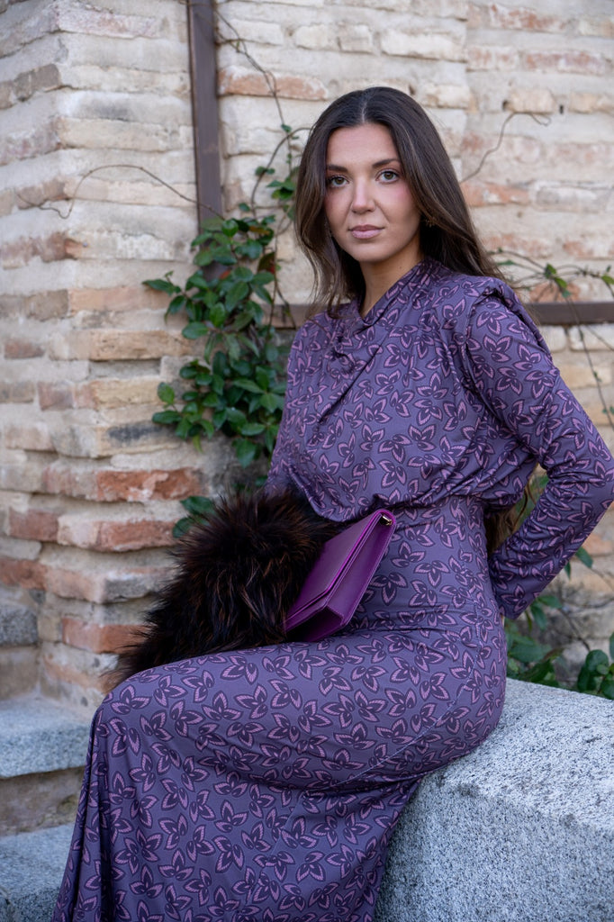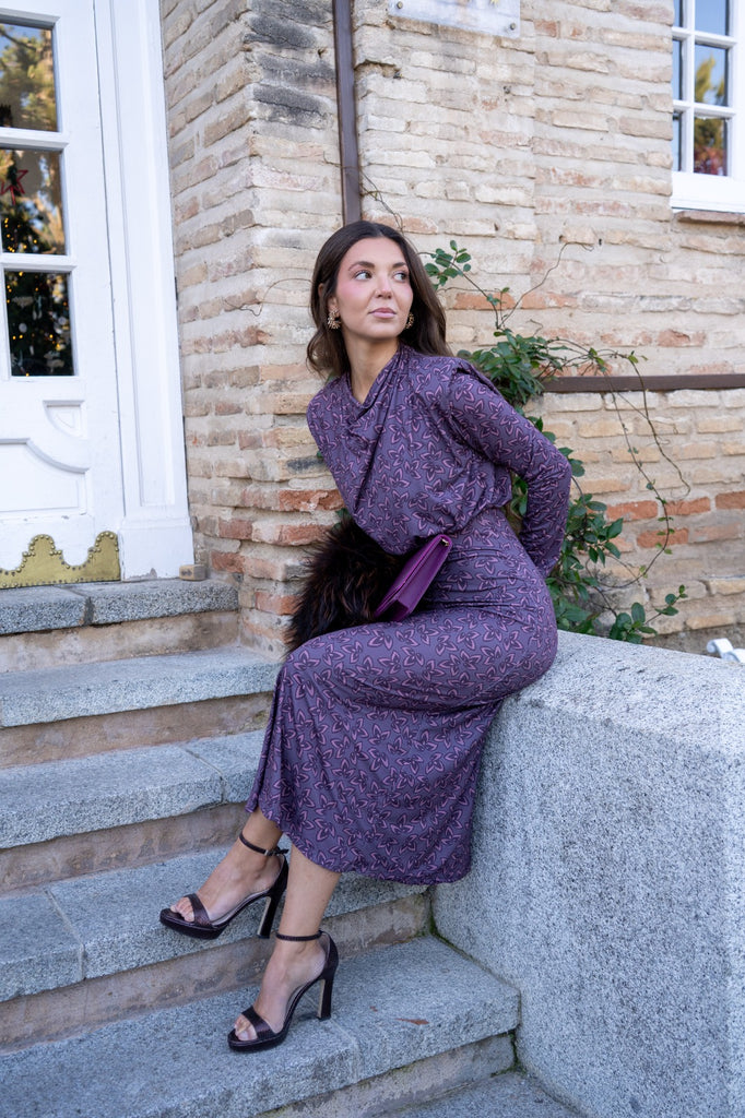 Vestido midi, cuello drapeado, corte en cintura, totalmente elástico, en color morado con estampado.
