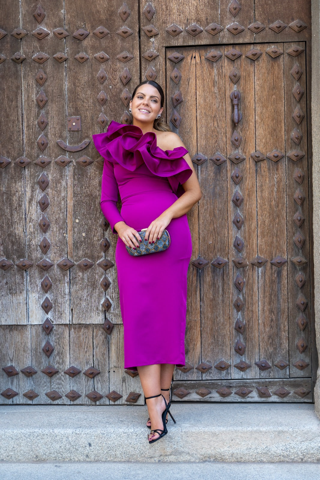 Midi dress with long sleeves on one side and a ruffle at the front and back, asymmetrical sleeves on the other, and a back slit. In bougainvillea.