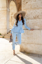 Set consisting of a brocade jacket with long sleeves, double-breasted with buttons and peplum. Trousers with a high waist. In blue.
