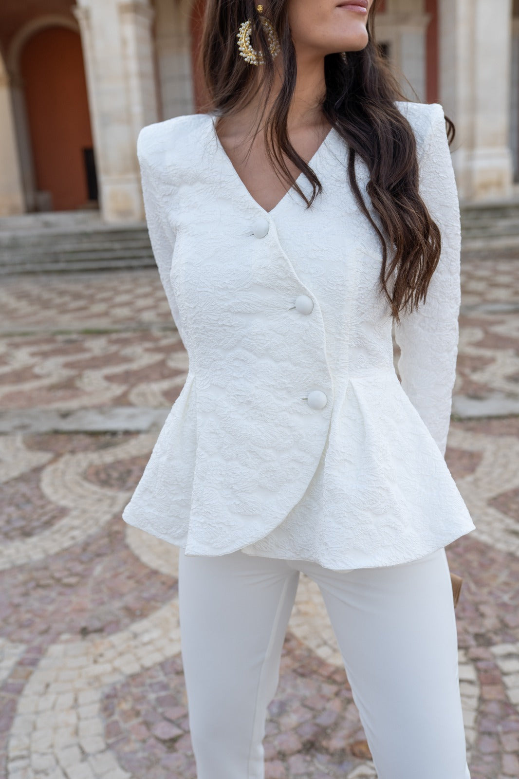 Set consisting of a brocade jacket with long sleeves, double-breasted with buttons and peplum. Trousers with a high waist. In white.