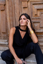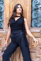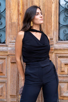 Top con escote drapeado en un tejido que se adapta perfectamente, lleva una cinta que podrás llevar de la forma que más te guste. En color negro.